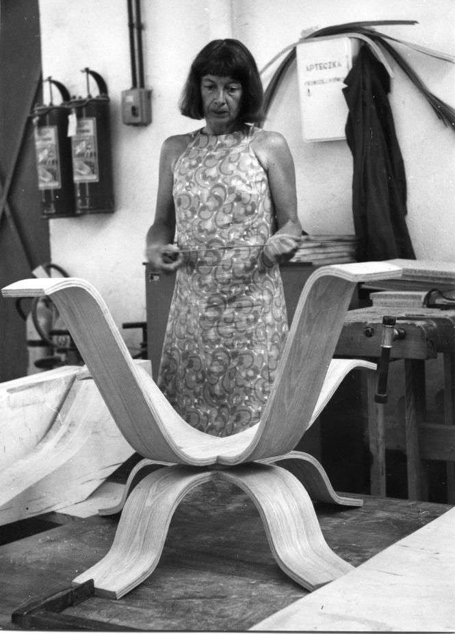 Maria Chomentowska przy eksperymentalnym meblu ze sklejki, IWP, około 1962