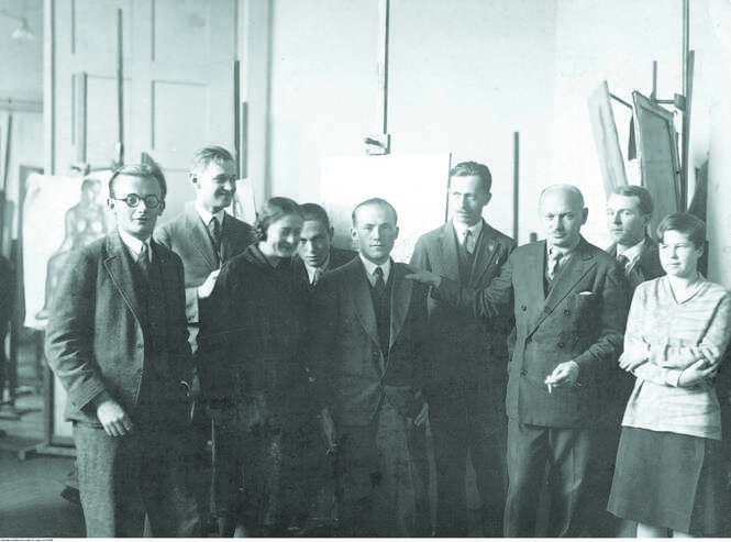 Warszawa. Szkoła Sztuk Pięknych (od lewej): Juliusz Studnicki, NN, Maria Szulczewska de Regibus, Marek Żuławski, asystent Jan Sokołowski, Michał Siemiradzki, profesor Felicjan Kowarski, Jan Wodyński, Maria Rużycka