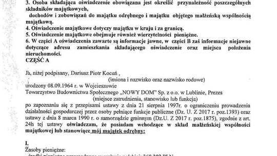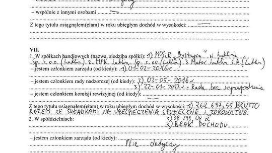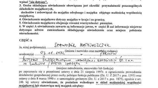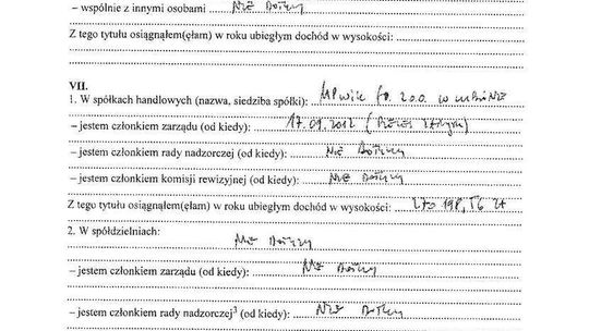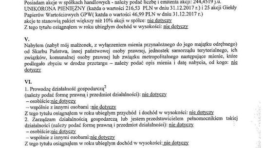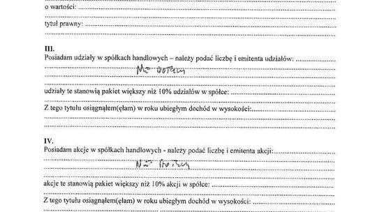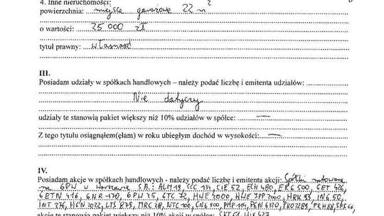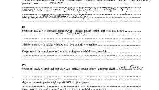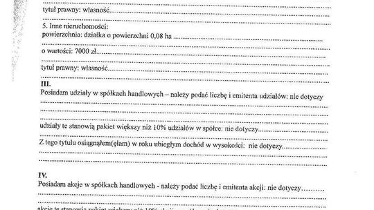 Nieruchomości: mieszkanie 76,5 mkw. warte 380 tys. zł (spółdzielcze własnościowe, współwłasność w 1/2), działka letniskowa 1400 mkw. z budynkiem mieszkalnym 105 mkw. o łącznej wartości 90 tys. zł (współwłasność w 1/2)