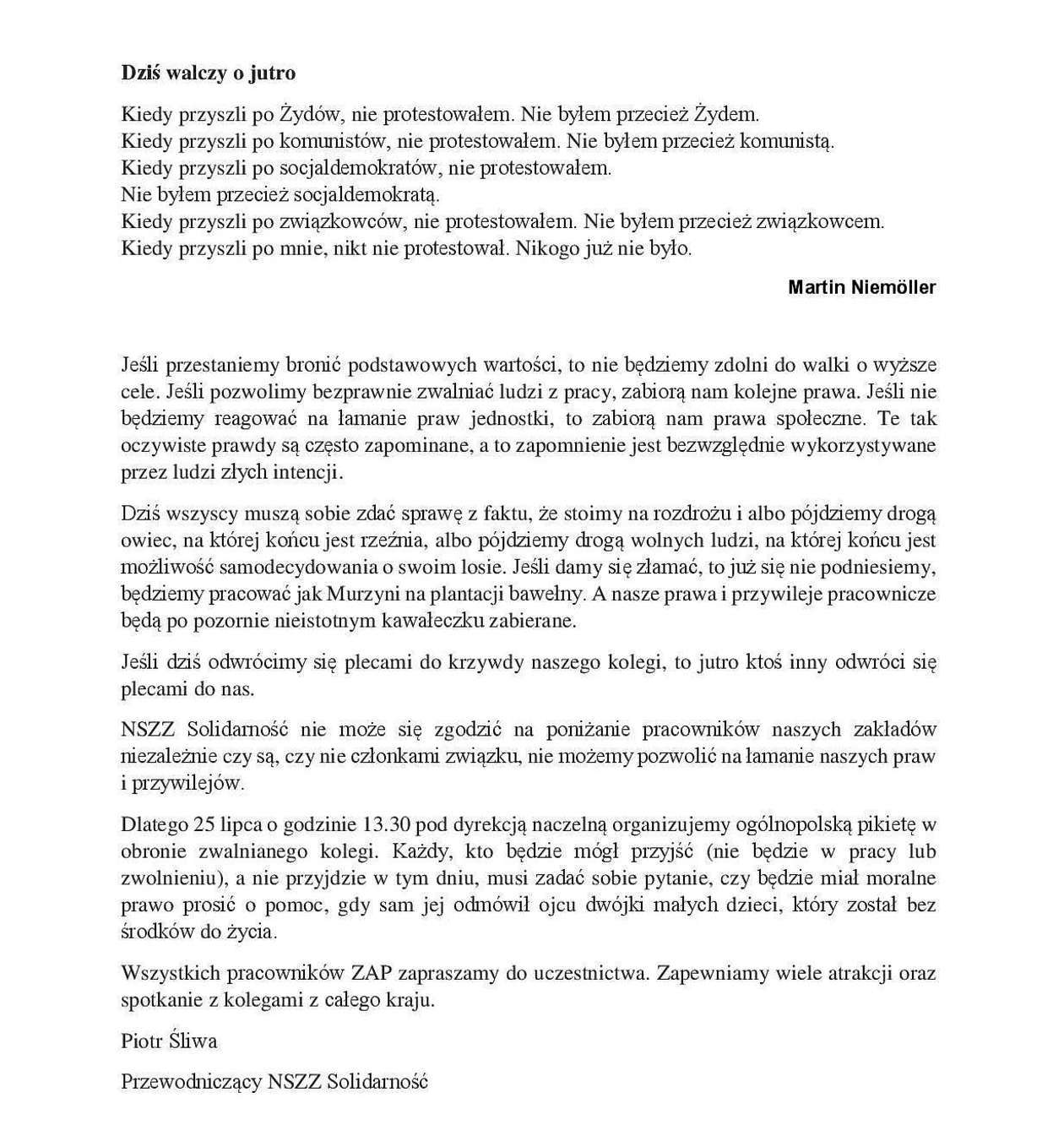 Apel przewodniczącego NSZZ Solidarność