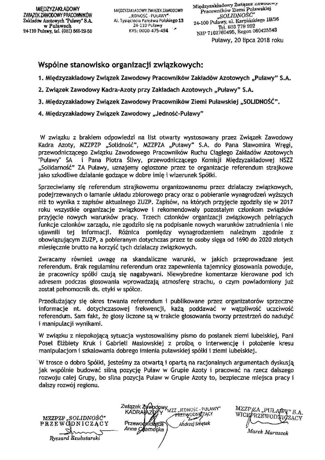 Wspólne stanowisko czterech organizacji związkowych