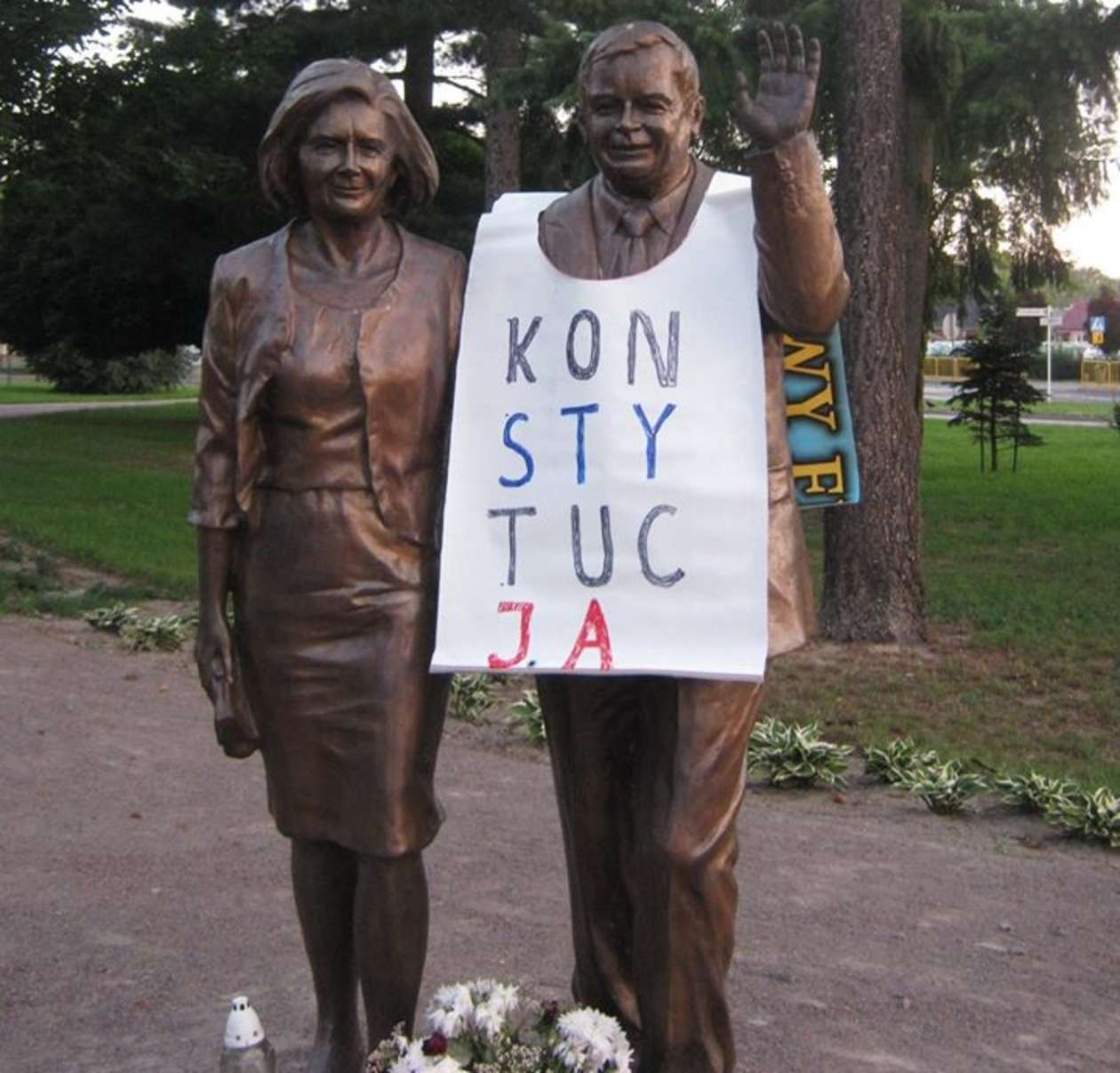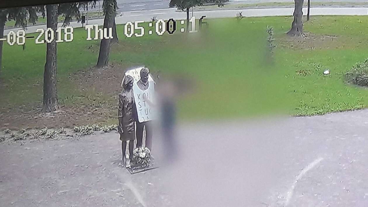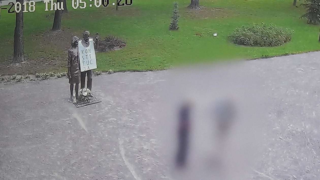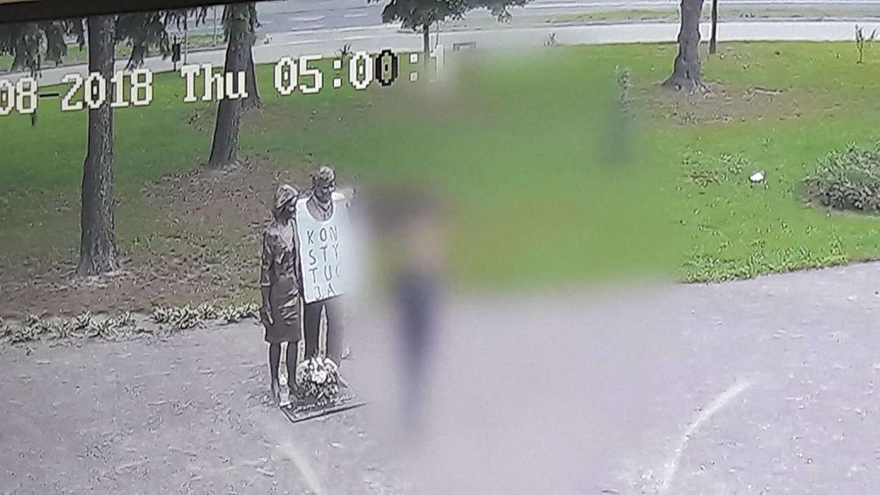 Zawiesili baner na pomniku Kaczyńskich. Zdjęcia z monitoringu