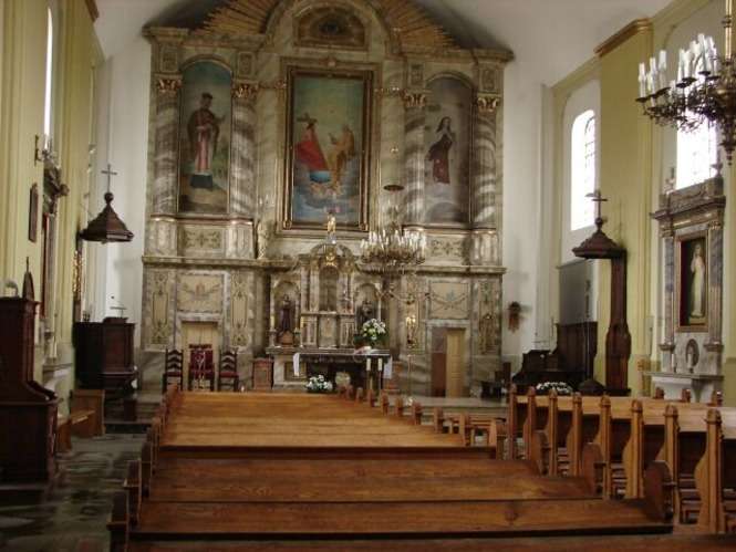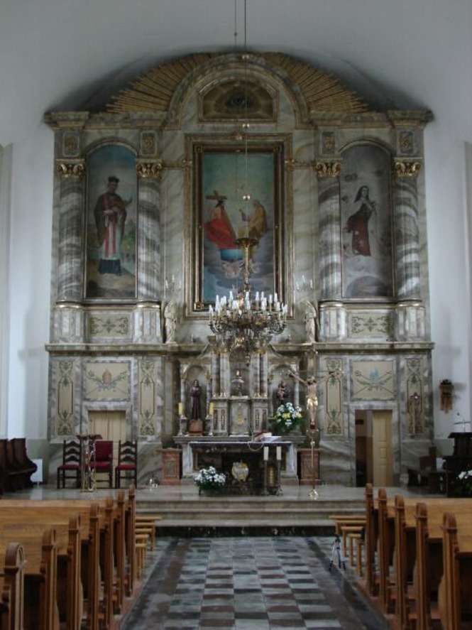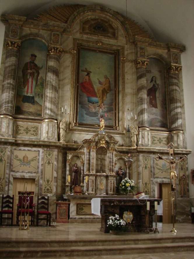 Oltarz glówny w stylu neorenesansowym. W oltarzu obrazy ?w. Jana Nepomucena (z lewej), Trójcy Przenaj?wietszej i ?w. Teresy (z prawej)