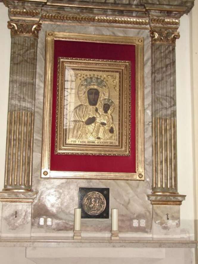 Oltarz boczny z wizerunkiem Matki Boskiej Czestochowskiej w zloconej sukni