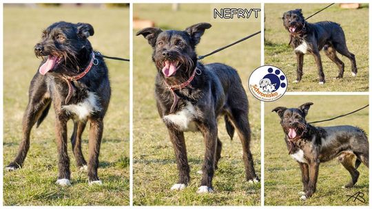 Nefryt, gdy trafił do schroniska był bardzo wystraszony i nieufny. Unikał kontaktu z człowiekiem, nie pozwalał się dotknąć. Po wielu próbach i długim czasie spędzonym z nim w boksie, w końcu przełamał się i zaakceptował dotyk, pozwala się głaskać. Nefryt zmienił się nie do poznania, nie jest już wystraszonym, siedzącym w kącie psem, a wesołym i radosnym psiakiem cieszącym się ze spacerów. Na smyczy chodzi bardzo ładnie. Pozwala się głaskać, nawet sam domaga się pieszczot. Nadal wymaga pracy, ale jest gotowy do adopcji dla osoby, która miłością i cierpliwością zdobędzie jego zaufanie.