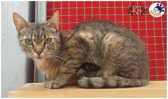 Kotka, ur. ok. 2013 r. Tojura6 to kotka o umaszczeniu szylkretowym. Obecnie to jedyna kotka w schronisku z tym niezwykle urodziwym futerkiem. Kotka bardzo stroni od człowieka, był moment kiedy otworzyła się na ludzi, zaczęła przychodzić i łasić się, jednak ostatnio znowu unika kontaktu. Uwielbia smaczki, co pozwala przekonać ją na moment, jednak za każdym razem gdy ktoś pojawia się w boksie reaguje wycofaniem się. Poszukujemy dla niej spokojnego domu i ludzi o ciepłym sercu, którzy pokochają ją i dadzą czas na oswojenie się