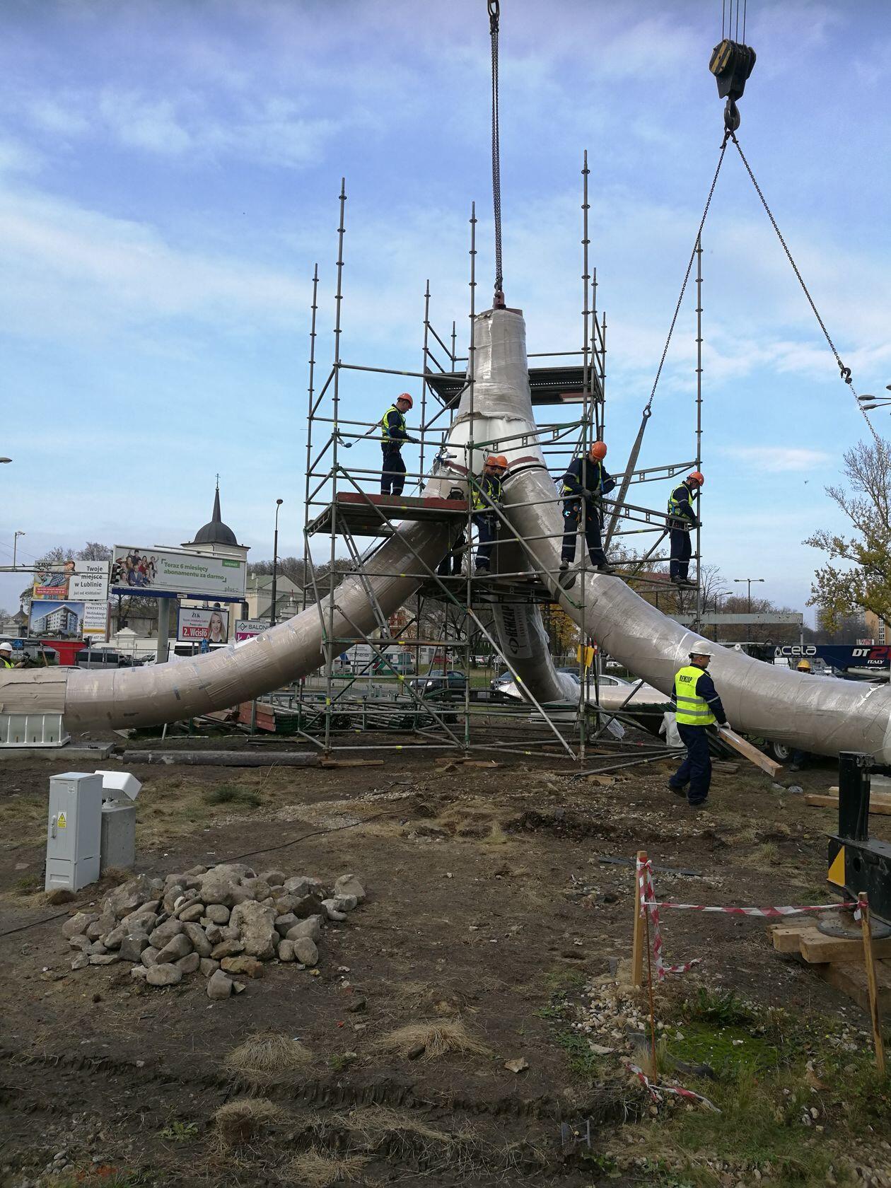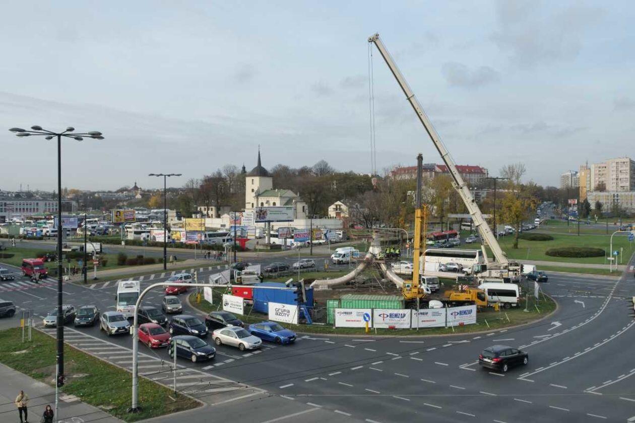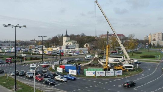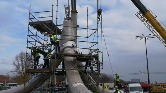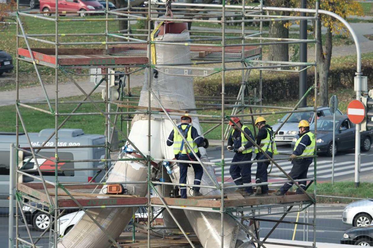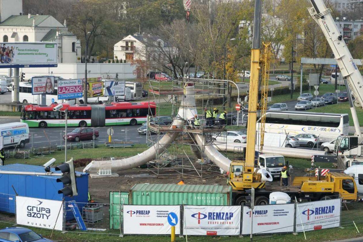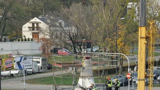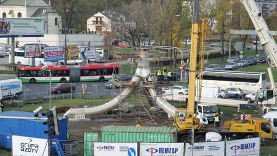 Trwa montaż Masztu Niepodległości na rondzie Dmowskiego