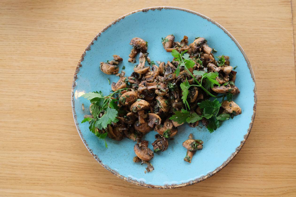 Składniki: 50 dag pieczarek, 10 dag cebuli, 5 dag czosnku, 4 dag natki pietruszki, 100 ml octu balsamicznego, oliwa z oliwek, sól, pieprz, cukier.