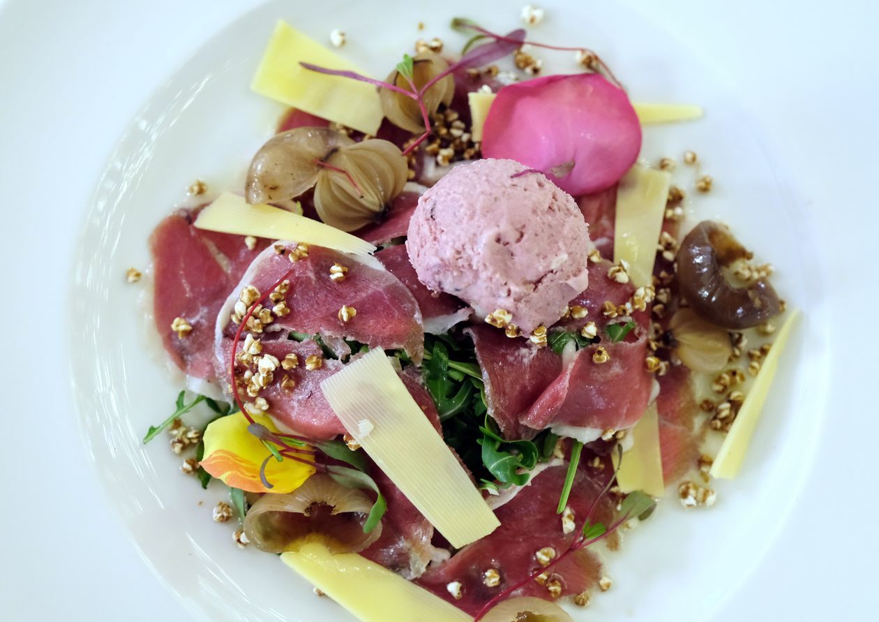 Carpaccio z kaczki w towarzystwie lodów o smaku leśnym z serem Bursztyn oraz marynowanymi cebulkami i ziarenkami gryki