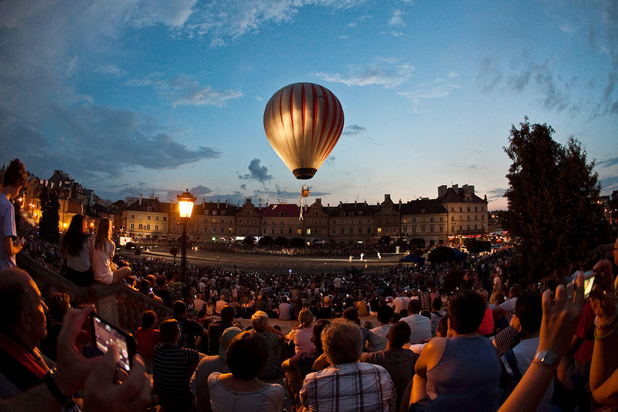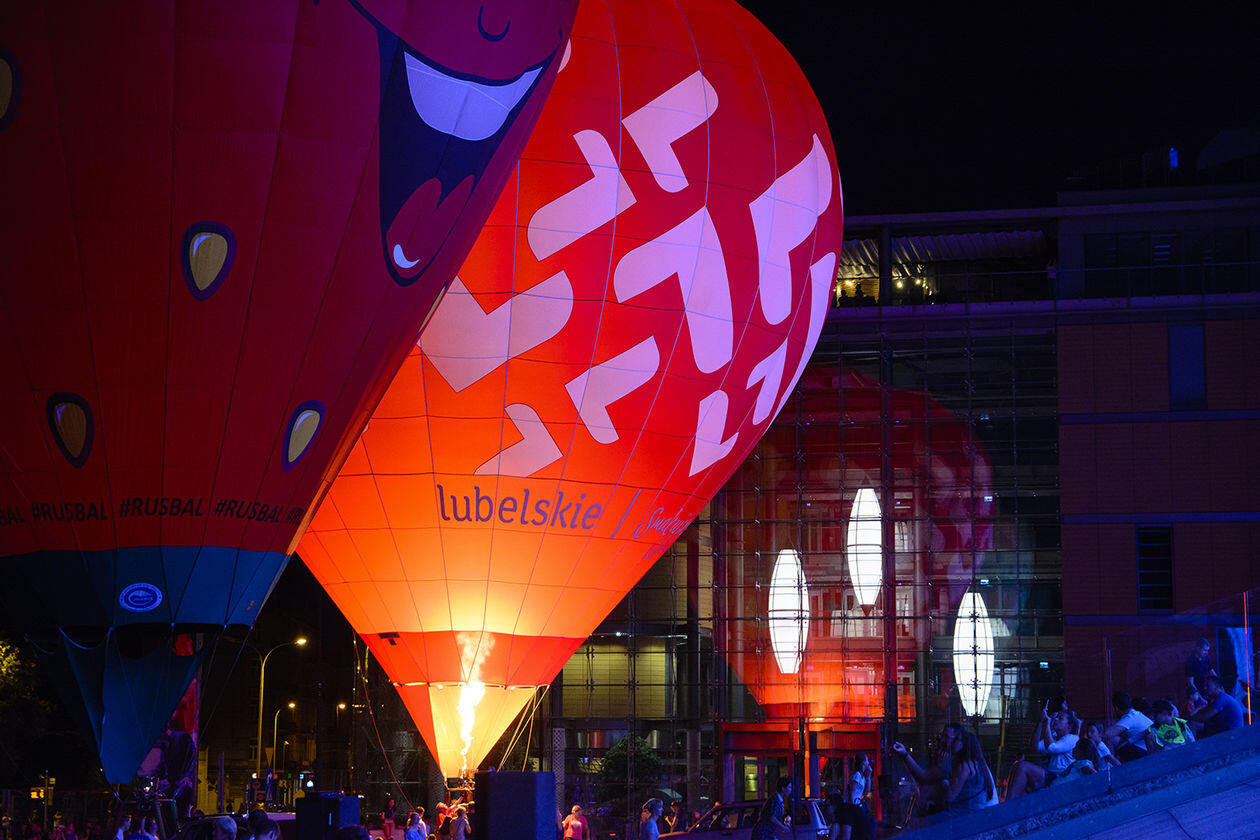 WYRÓŻNIENIE. Nocny pokaz balonów na Placu Teatralnym w Lublinie.