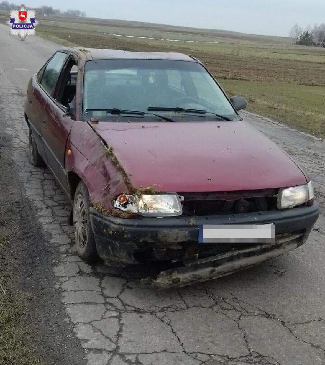 Zgnieciony dach, zniszczony bok. Pijany jechał rozbitym samochodem
