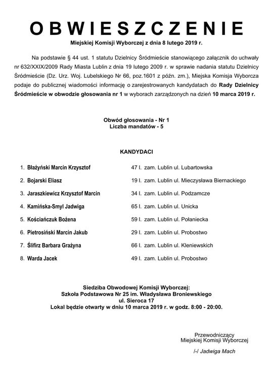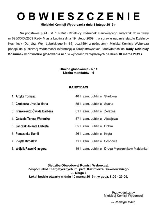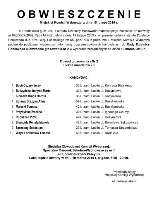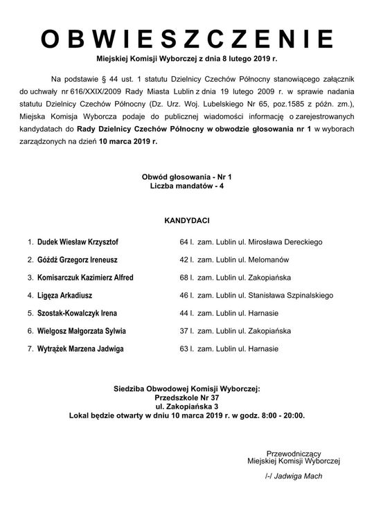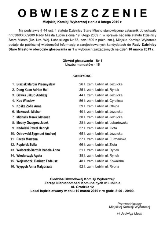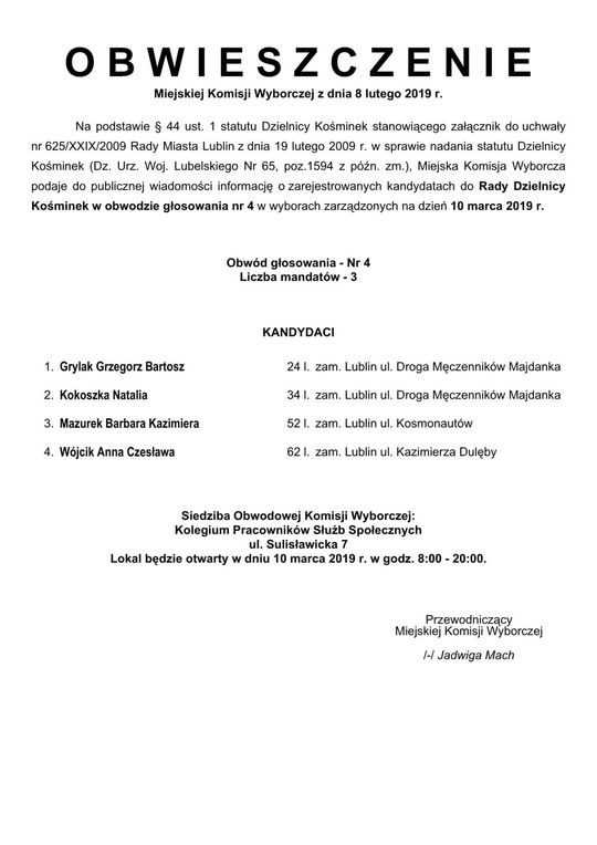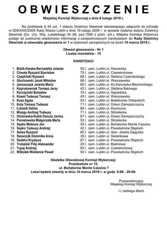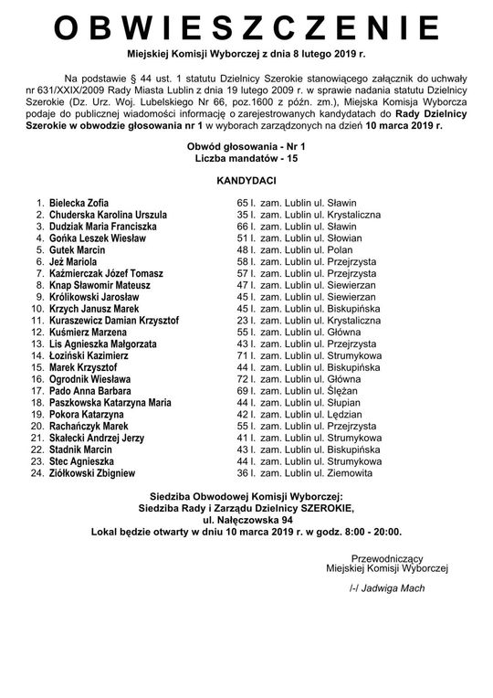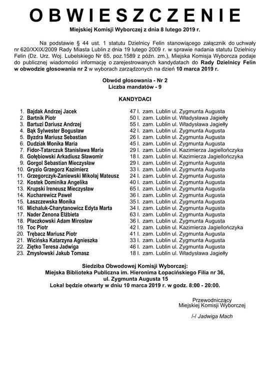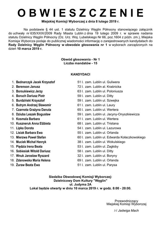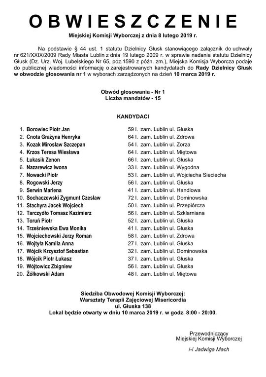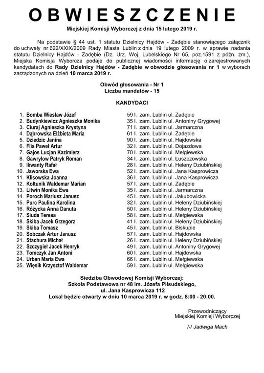 Wybory do Rad Dzielnic 2019 w Lublinie. Lista kandydatów
