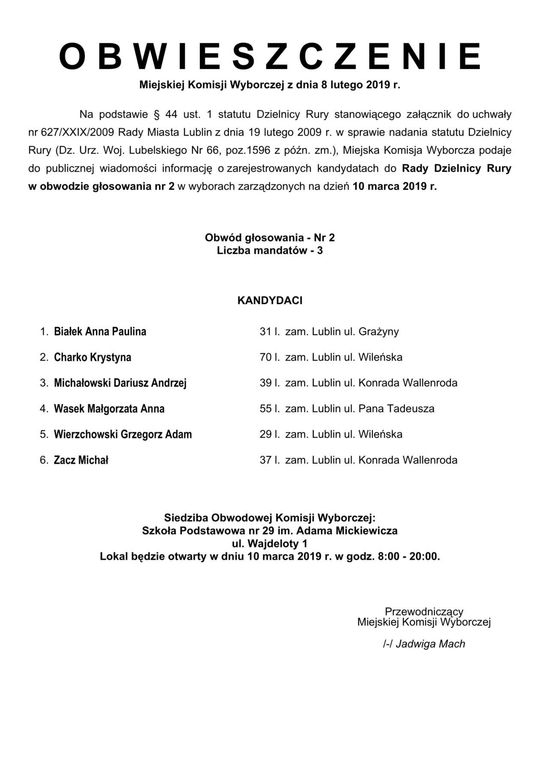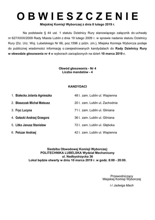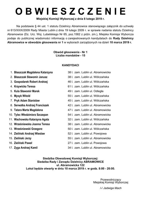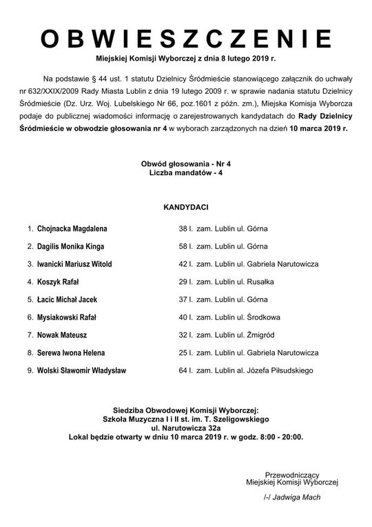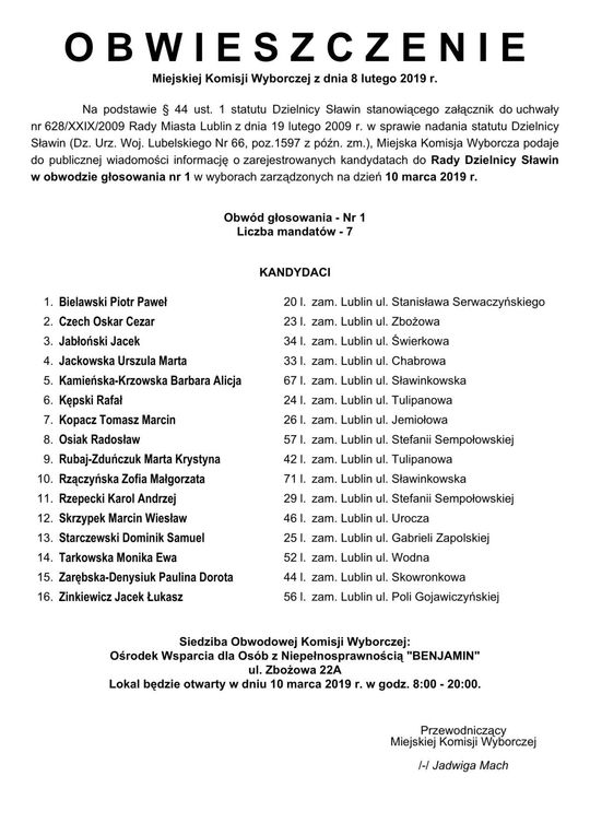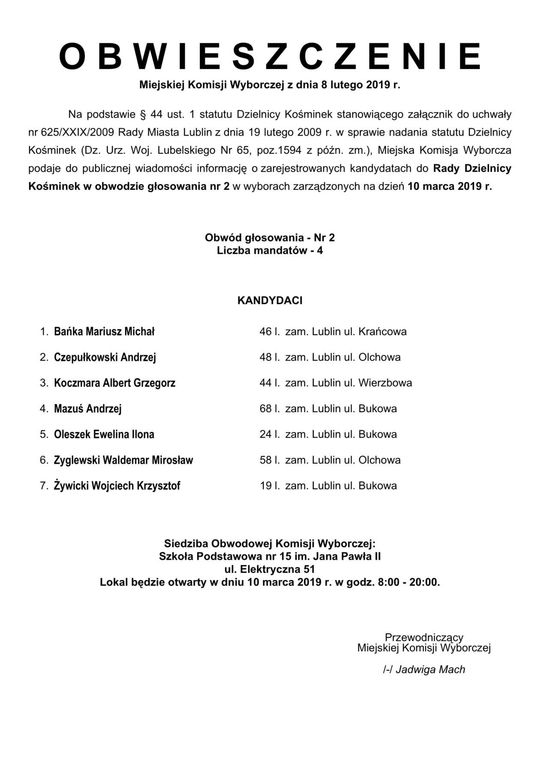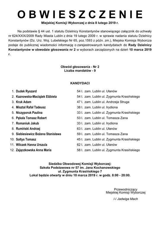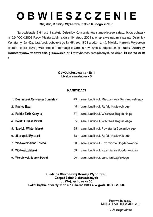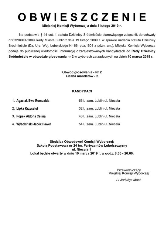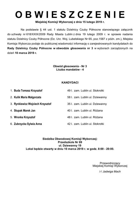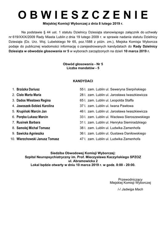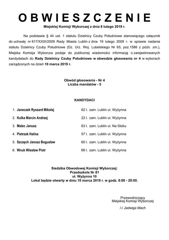 Wybory do Rad Dzielnic 2019 w Lublinie. Lista kandydatów
