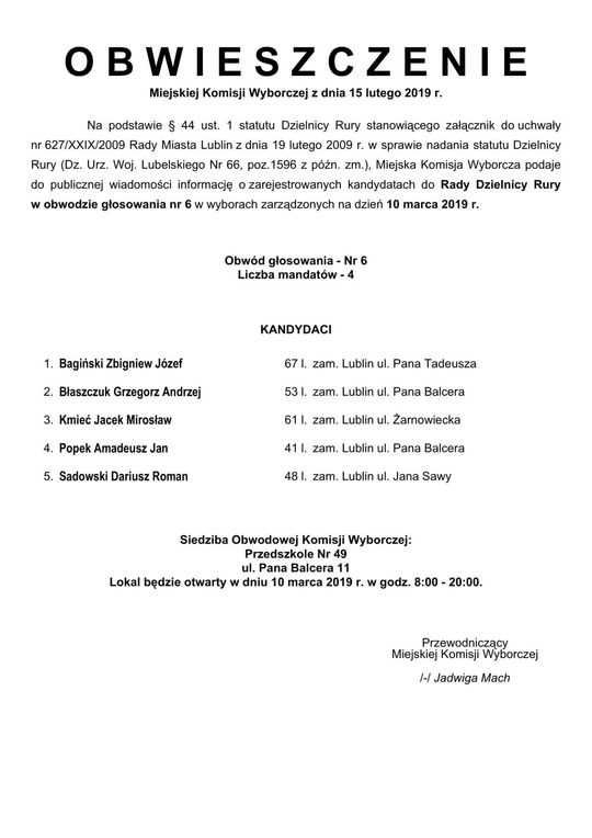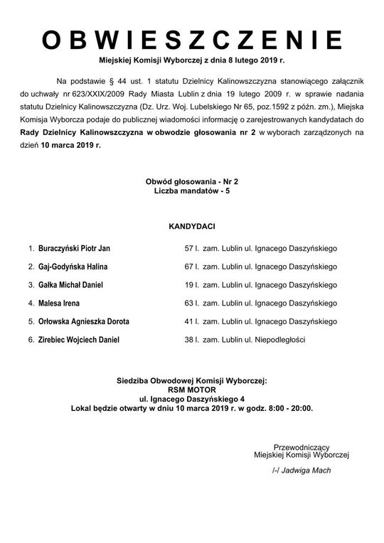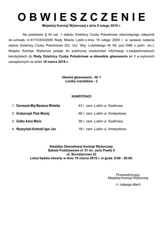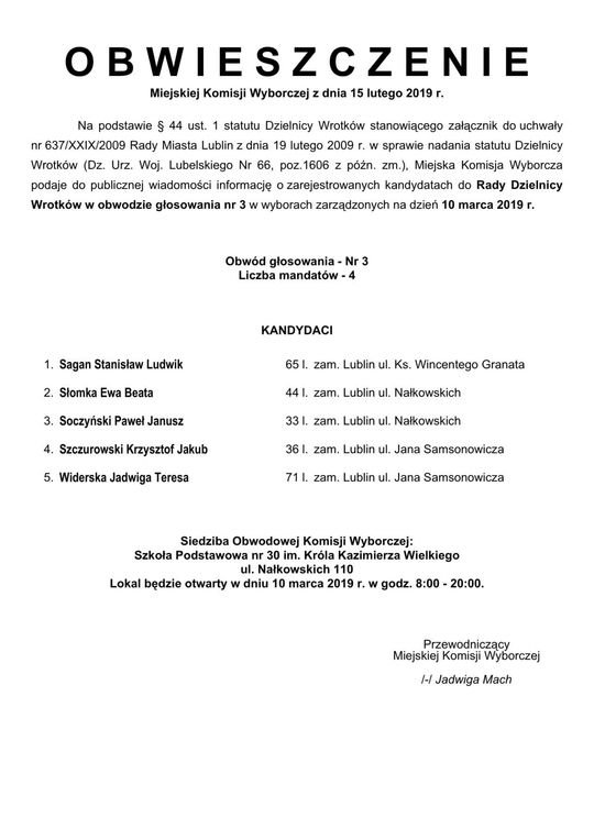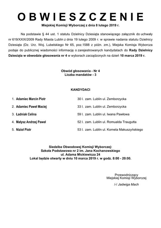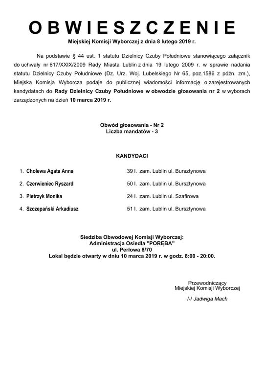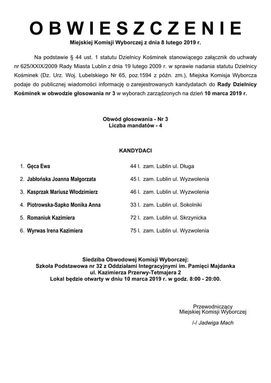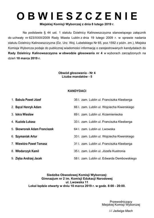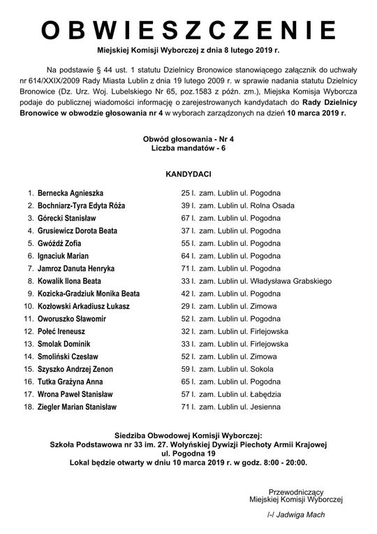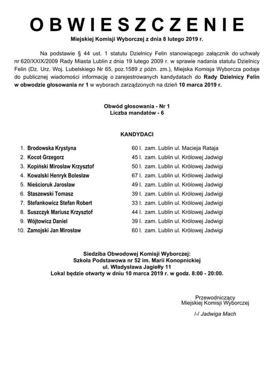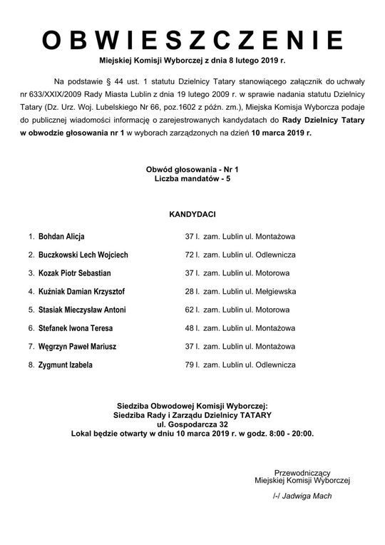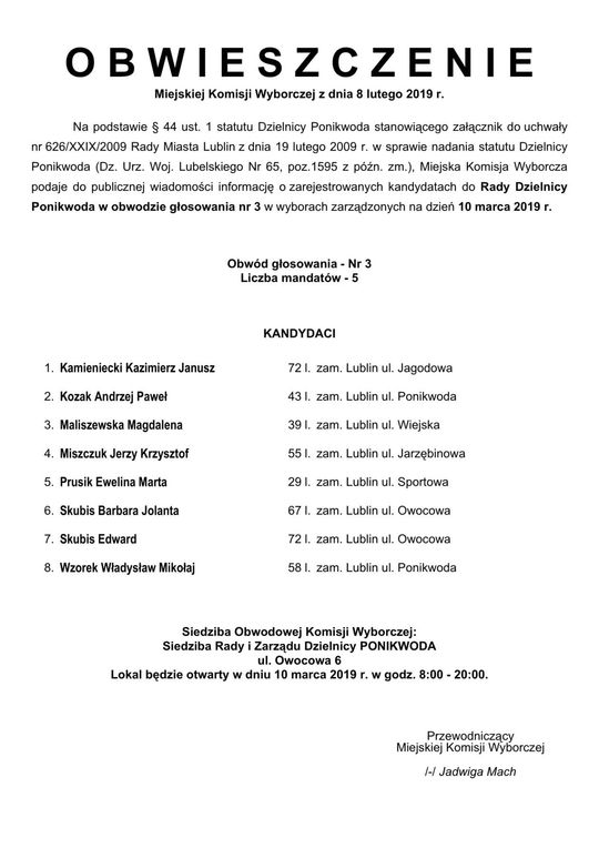 Wybory do Rad Dzielnic 2019 w Lublinie. Lista kandydatów