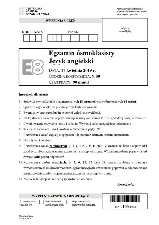 Egzamin ósmoklasisty 2019 angielski arkusze CKE