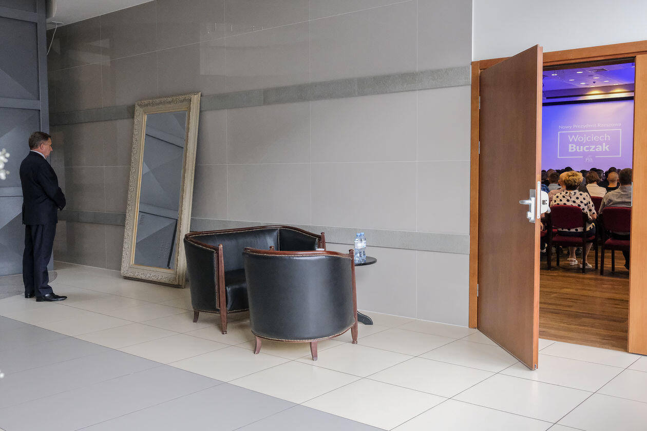 Rzeszów. Poseł Wojciech Buczak, kandydat PiS na prezydenta Rzeszowa, na chwilę przed wejściem na scenę podczas konwencji programowej partii.