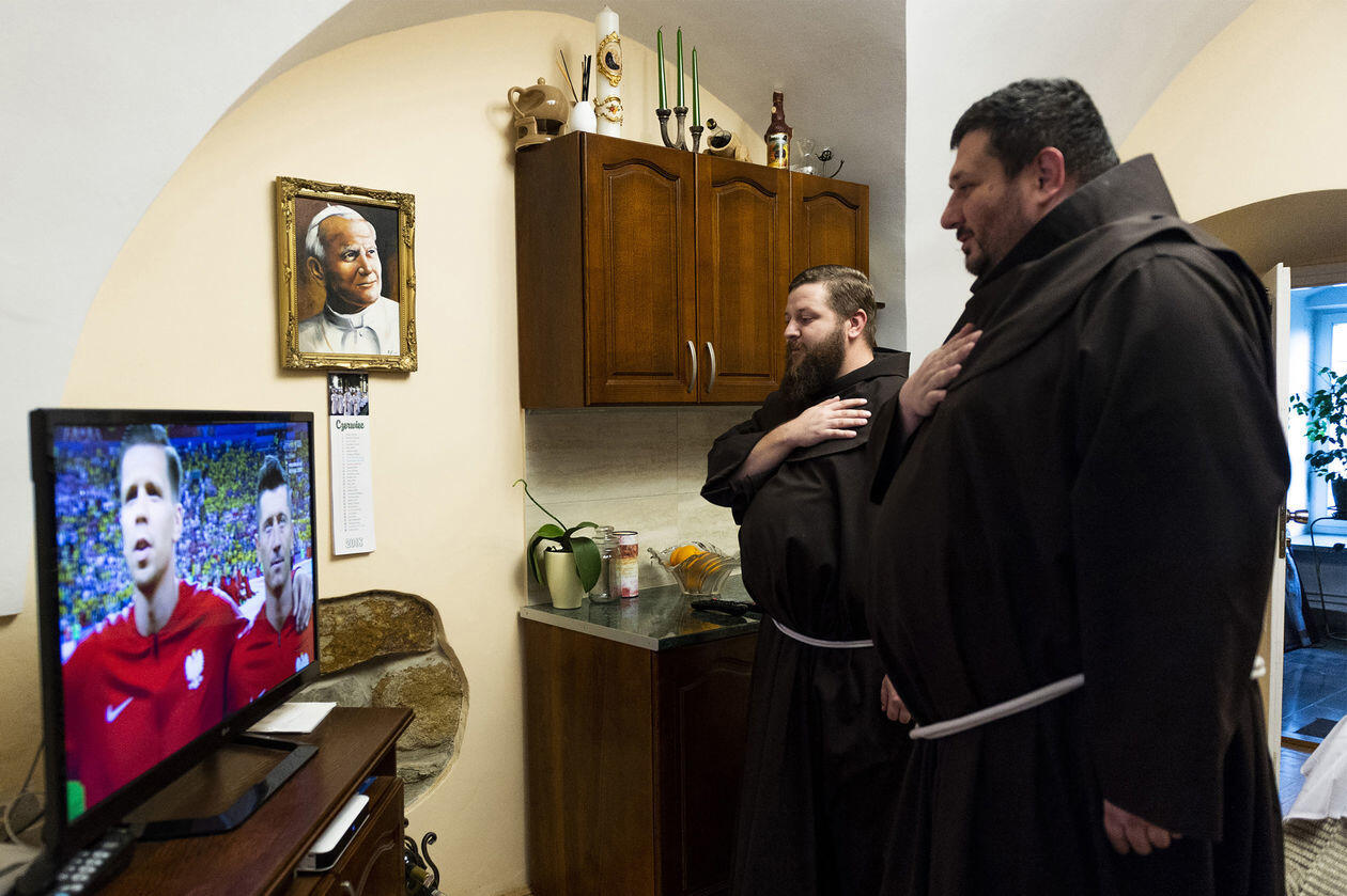 Małopolska, Zakliczyn. Bracia franciszkanie z zakonu w Zakliczynie podczas hymnu narodowego przed meczem Polska – Kolumbia podczas Mistrzostw Świata w Piłce Nożnej w Rosji. Polska przegrała 0:3.