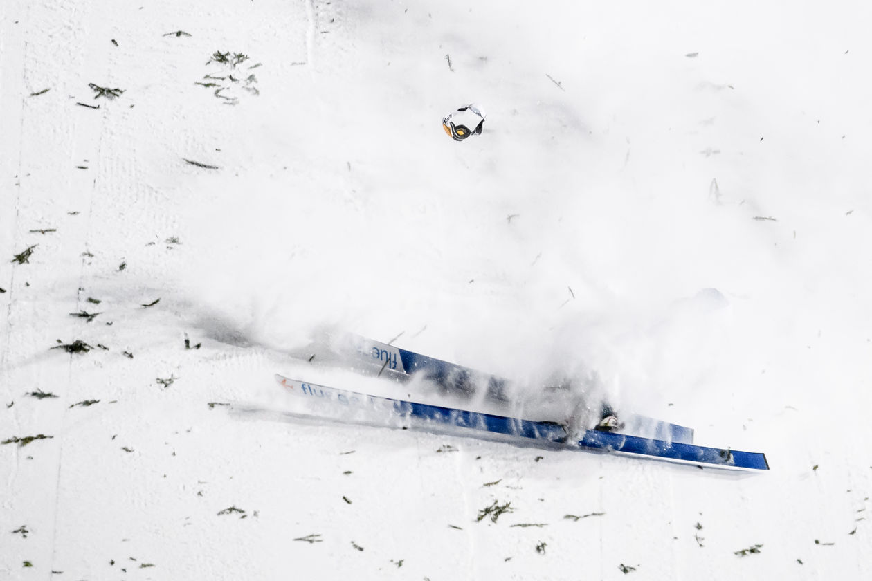 Niemiec David Siegel upada podczas lądowania w drugiej serii konkursu drużynowego Pucharu Świata w Skokach Narciarskich w Zakopanem.