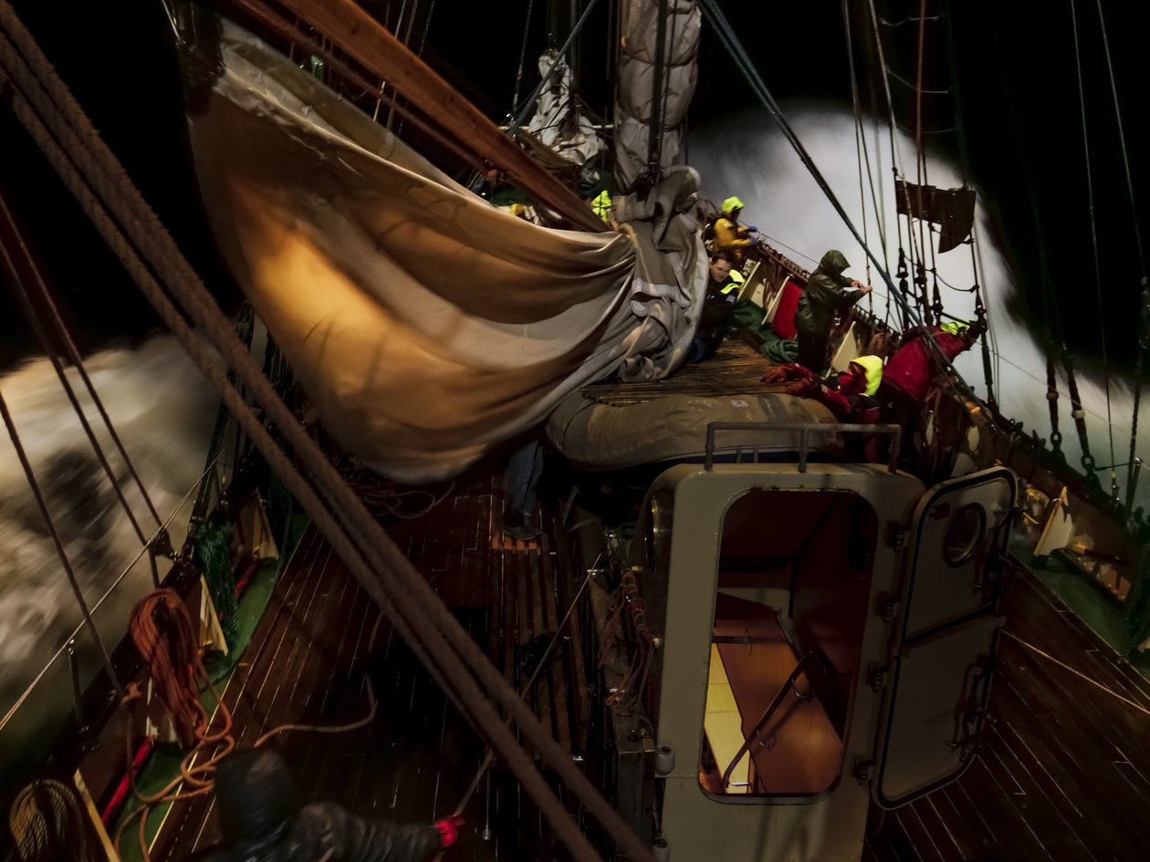 Załoga żaglowca „Zawisza Czarny” stawia żagle w nocy, na sztormowych falach o wysokości 5–6 m. Był to tygodniowy rejs szkoleniowy z Gdyni do Szwecji i z powrotem.