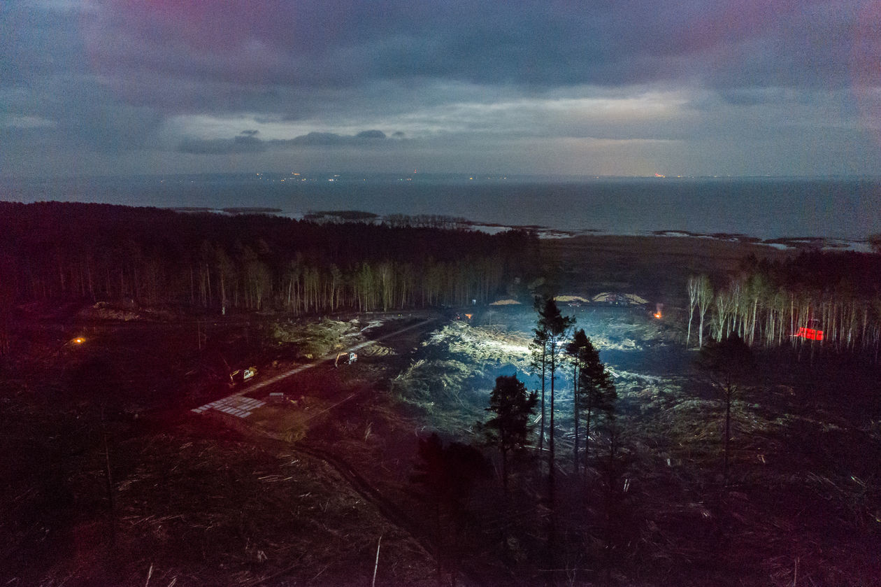 Skowronki. Pod przyszły przekop Mierzei Wiślanej wycięto ponad 10 tys. drzew. Żeby zdążyć z zakończeniem prac przed okresem ochronnym ptaków, wycinanie prowadzono całą dobę.