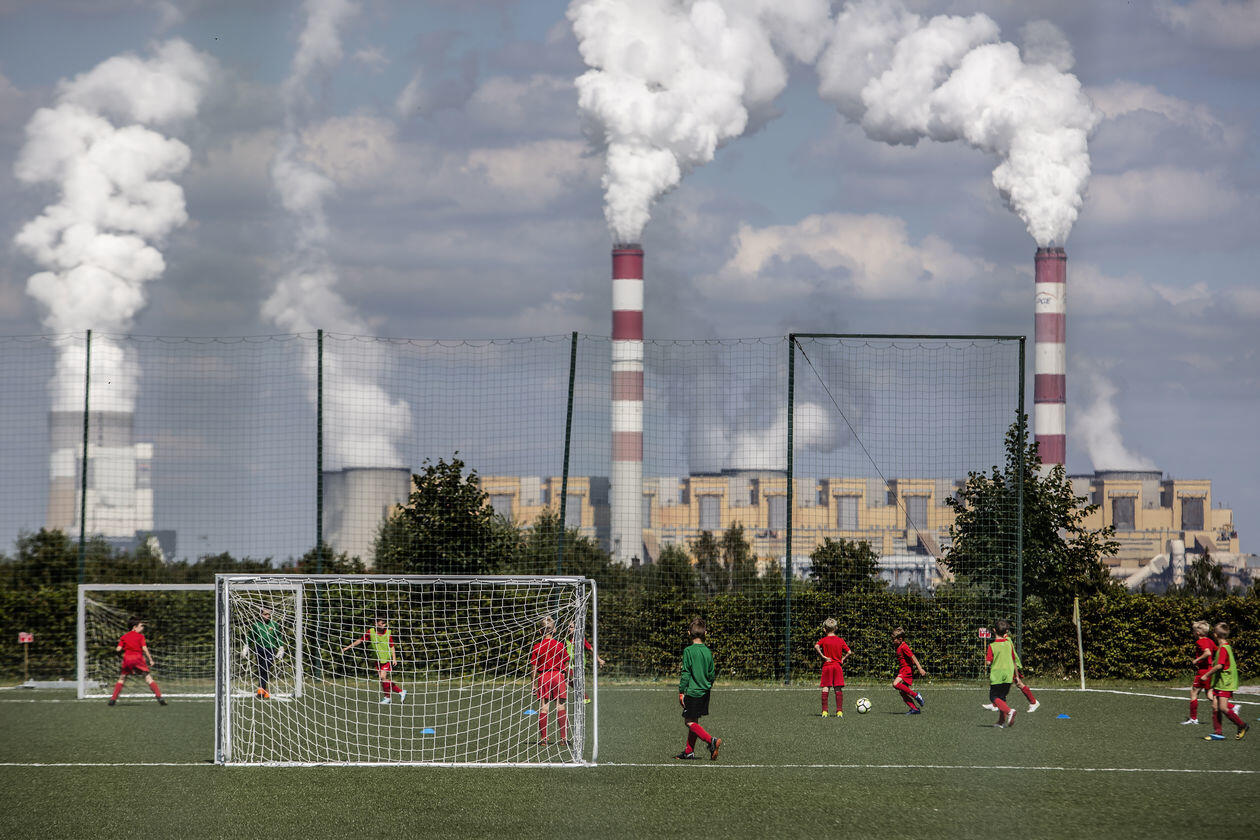 Kleszczów. Młodzi piłkarze podczas treningu w kompleksie rekreacyjnym Solpark w Kleszczowie. Ta niewielka gmina jest najbogatsza w Polsce ze względu na znajdujące się na jej terenie kopalnię odkrywkową węgla brunatnego i elektrownię KWB Bełchatów. KWB Bełchatów została uznana przez Europejską Agencję Środowiska za najbardziej zanieczyszczający powietrze i wodę obiekt w Europie.