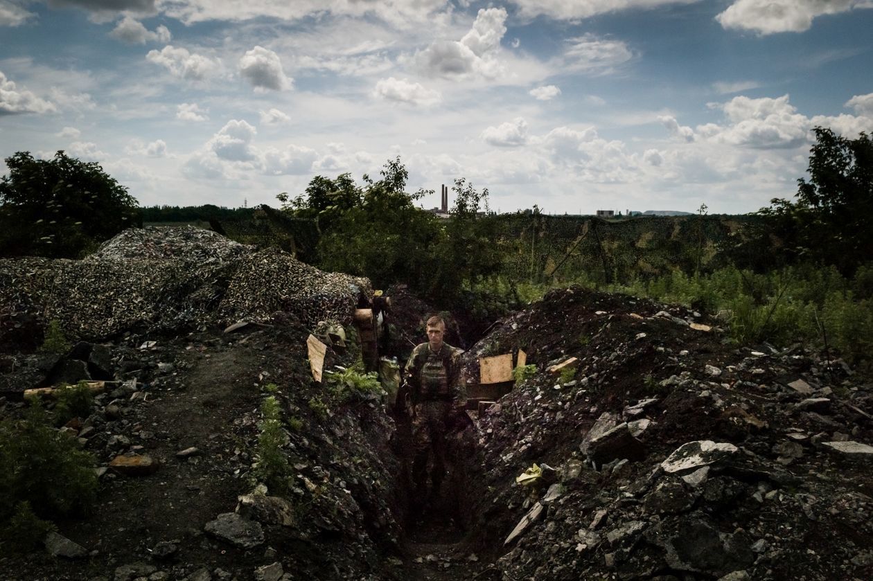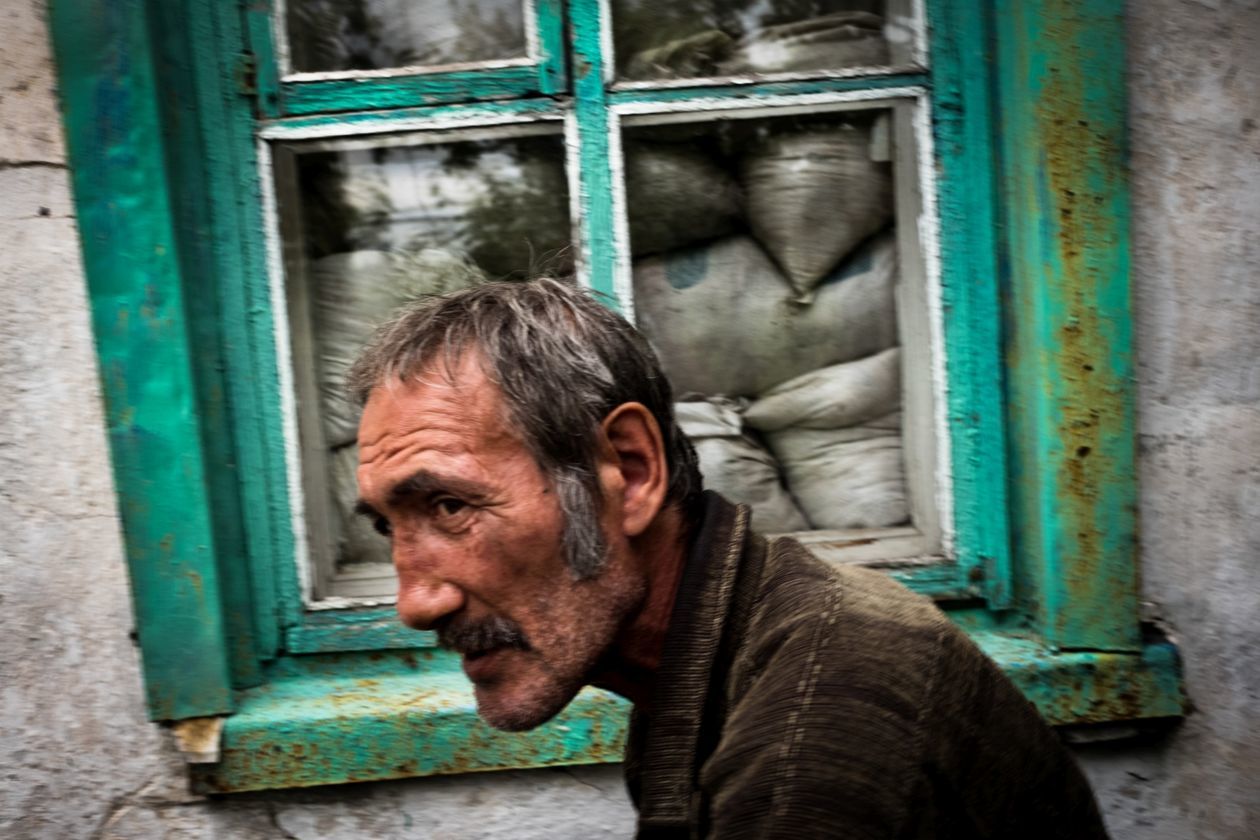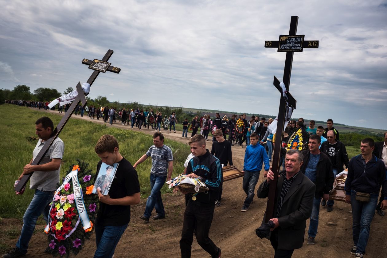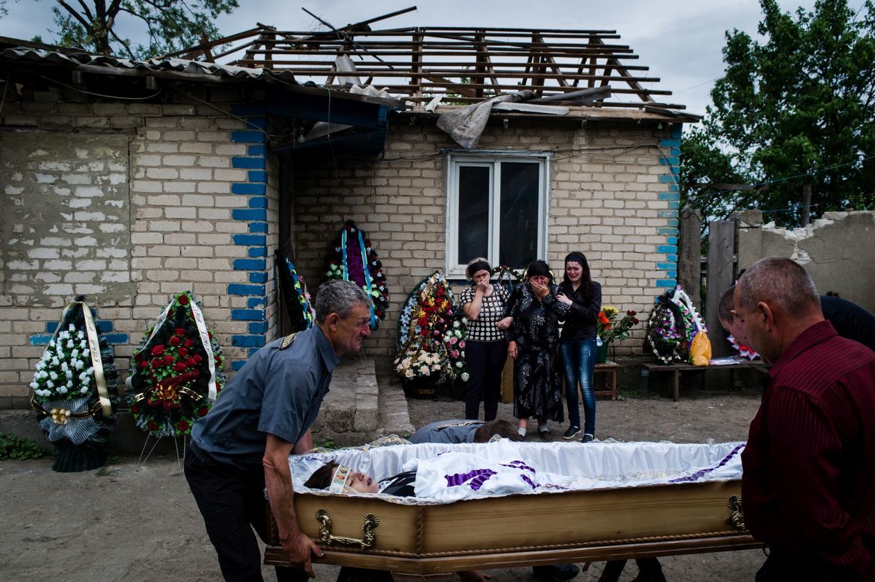 Ukraina: Trawnewe, Trojeckie. Wojna na Ukrainie trwa już piąty rok. Początkowo dynamiczny konflikt przerodził się w statyczną wojnę pozycyjną. Mimo porozumień mińskich, mających gwarantować zawieszenie broni, naruszenia rozejmu zdarzają się codziennie. Praktycznie codziennie też w wyniku ostrzałów giną ludzie – wojskowi i cywile. Na zdjęciach kolejno: 1) Worki z piaskiem w ostrzelanym domu w Trawnewe. Został trafiony kilkoma pociskami 14,5 mm wystrzelonymi w kierunku żołnierzy ukraińskich wracających z posterunku. Pociski przebiły framugi, ściany wewnętrzne i komin. 2) Ranny Andriej Macuj leży na podłodze domu sąsiadki Haliny, która rozpacza przerażona po ostrzale miejscowości Trojeckie. W nocy z 17 na 18 maja na wieś spadło ok. 10 pocisków moździerzowych. Ostatni trafił w dom państwa Macujów. Andriej i jego matka Swietłana przeżyli, zginął natomiast jego ojciec Jurij i 13-letni brat Dima. Ranny Andriej doczołgał się do domu Haliny, prosząc o pomoc. Po ponadgodzinnym oczekiwaniu karetka przyjechała tylko ze względu na to, że na miejscu byli dziennikarze goszczący u Haliny. 3) Ciało 13-letniego Dimy Macuja jest wnoszone na dziedziniec domu, w którym zginął. W tle babcia chłopca Vala Macuj i rodzina. 4) 5) Pogrzeb Dimy i Jurija Macujów zabitych w ostrzale moździerzowym miejscowości Trojeckie. 6) Ukraiński żołnierz „Brawo” na najbardziej wysuniętym posterunku we wsi Trawnewe. Na horyzoncie pozycje przeciwnika.