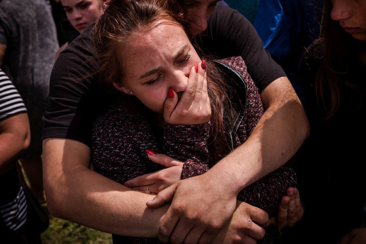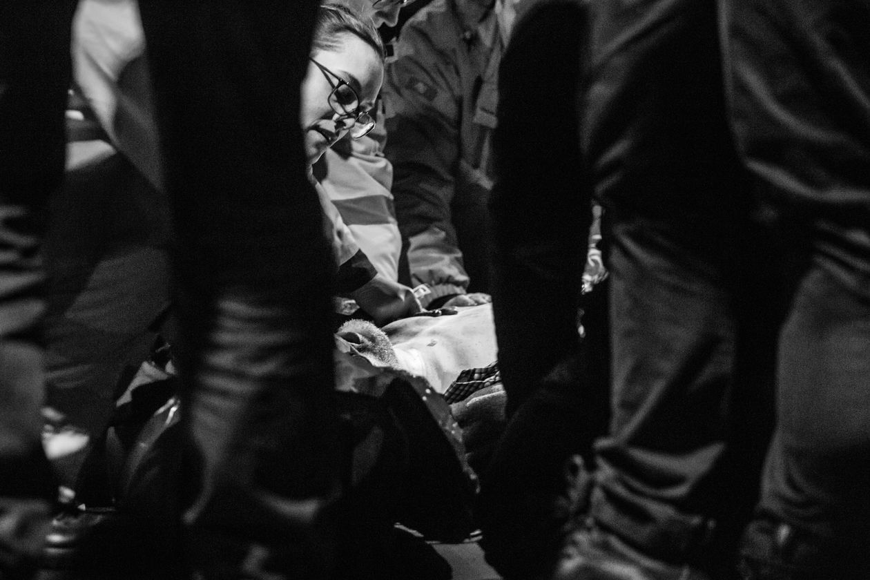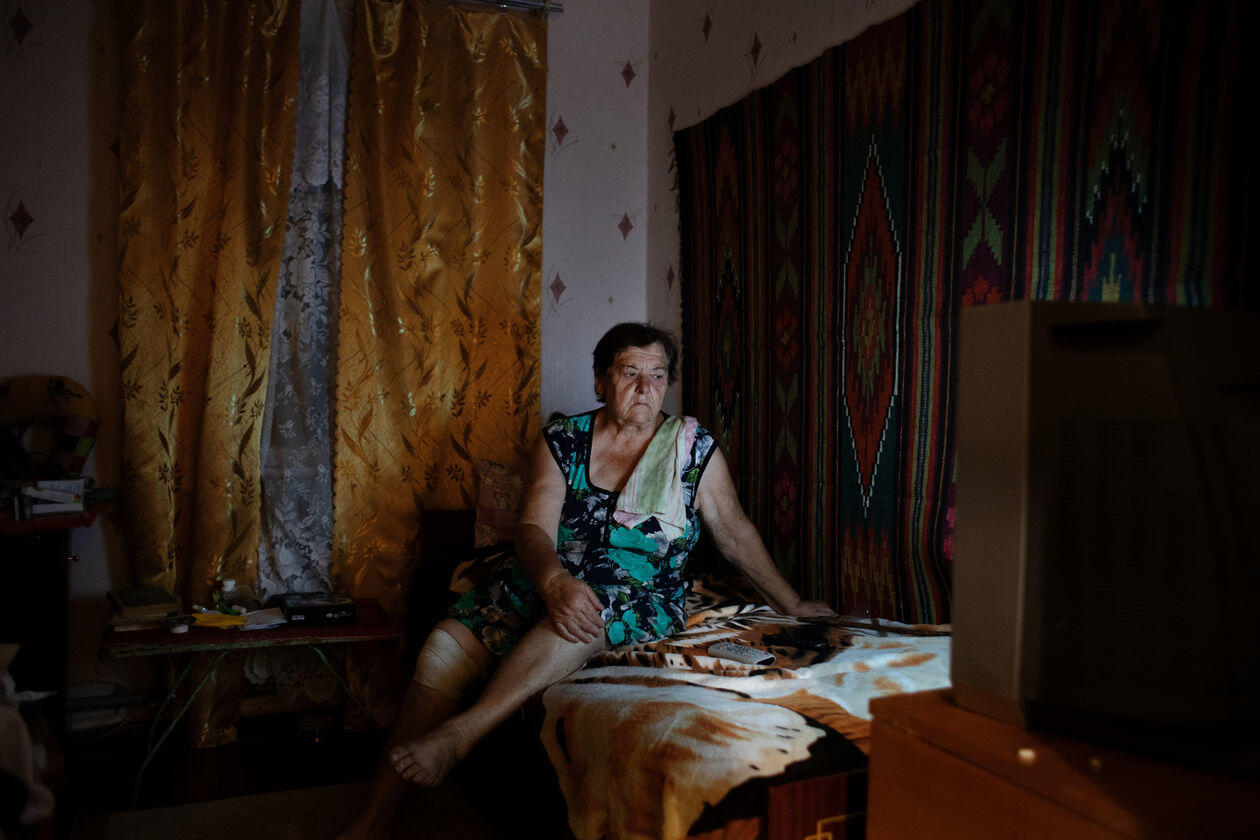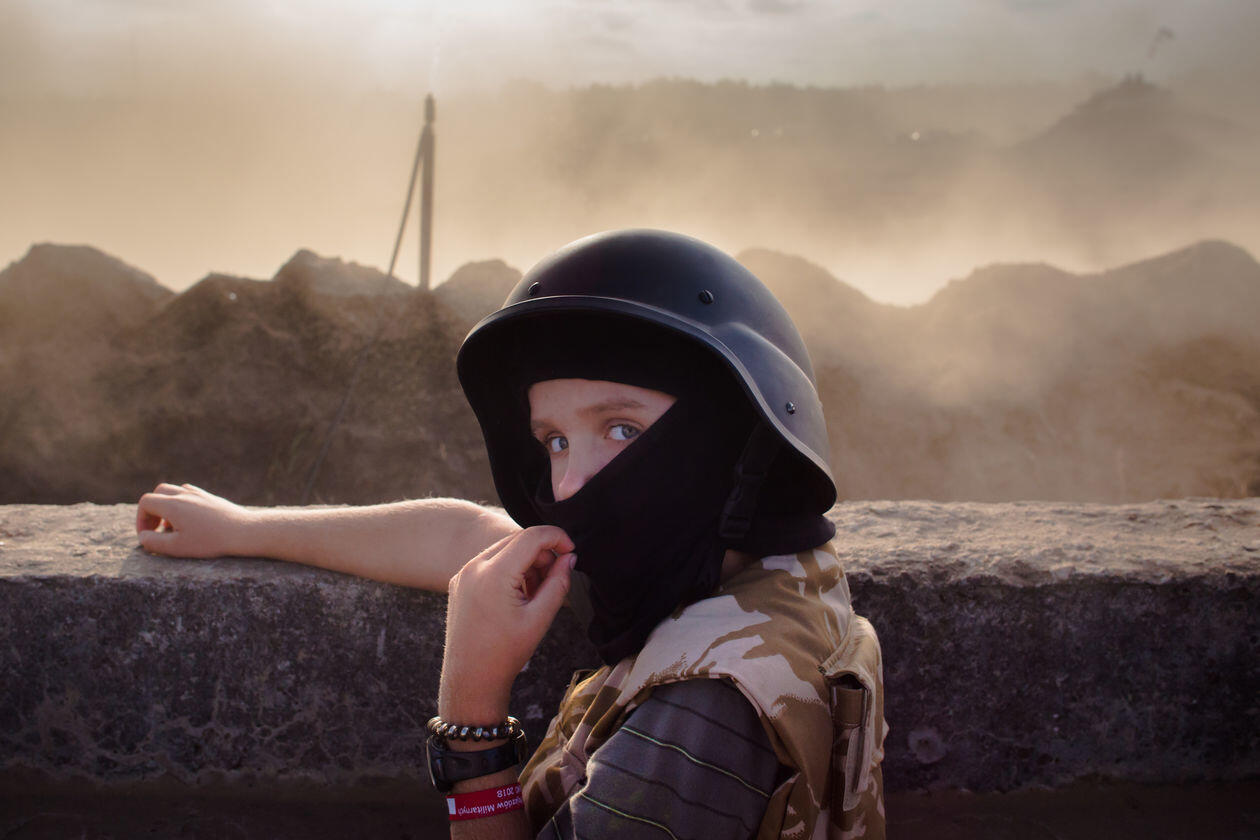 Ukraina: Trawnewe, Trojeckie. Wojna na Ukrainie trwa już piąty rok. Początkowo dynamiczny konflikt przerodził się w statyczną wojnę pozycyjną. Mimo porozumień mińskich, mających gwarantować zawieszenie broni, naruszenia rozejmu zdarzają się codziennie. Praktycznie codziennie też w wyniku ostrzałów giną ludzie – wojskowi i cywile. Na zdjęciach kolejno: 1) Worki z piaskiem w ostrzelanym domu w Trawnewe. Został trafiony kilkoma pociskami 14,5 mm wystrzelonymi w kierunku żołnierzy ukraińskich wracających z posterunku. Pociski przebiły framugi, ściany wewnętrzne i komin. 2) Ranny Andriej Macuj leży na podłodze domu sąsiadki Haliny, która rozpacza przerażona po ostrzale miejscowości Trojeckie. W nocy z 17 na 18 maja na wieś spadło ok. 10 pocisków moździerzowych. Ostatni trafił w dom państwa Macujów. Andriej i jego matka Swietłana przeżyli, zginął natomiast jego ojciec Jurij i 13-letni brat Dima. Ranny Andriej doczołgał się do domu Haliny, prosząc o pomoc. Po ponadgodzinnym oczekiwaniu karetka przyjechała tylko ze względu na to, że na miejscu byli dziennikarze goszczący u Haliny. 3) Ciało 13-letniego Dimy Macuja jest wnoszone na dziedziniec domu, w którym zginął. W tle babcia chłopca Vala Macuj i rodzina. 4) 5) Pogrzeb Dimy i Jurija Macujów zabitych w ostrzale moździerzowym miejscowości Trojeckie. 6) Ukraiński żołnierz „Brawo” na najbardziej wysuniętym posterunku we wsi Trawnewe. Na horyzoncie pozycje przeciwnika.