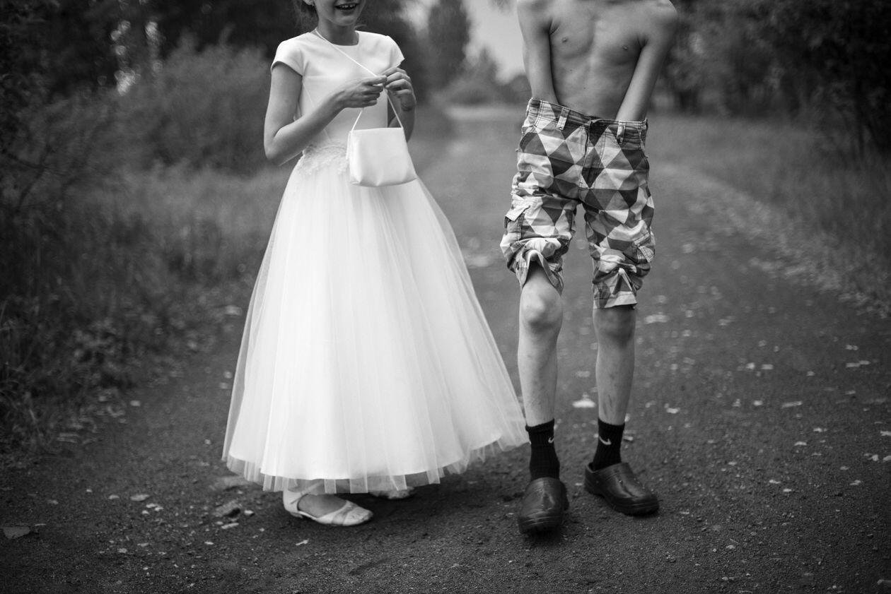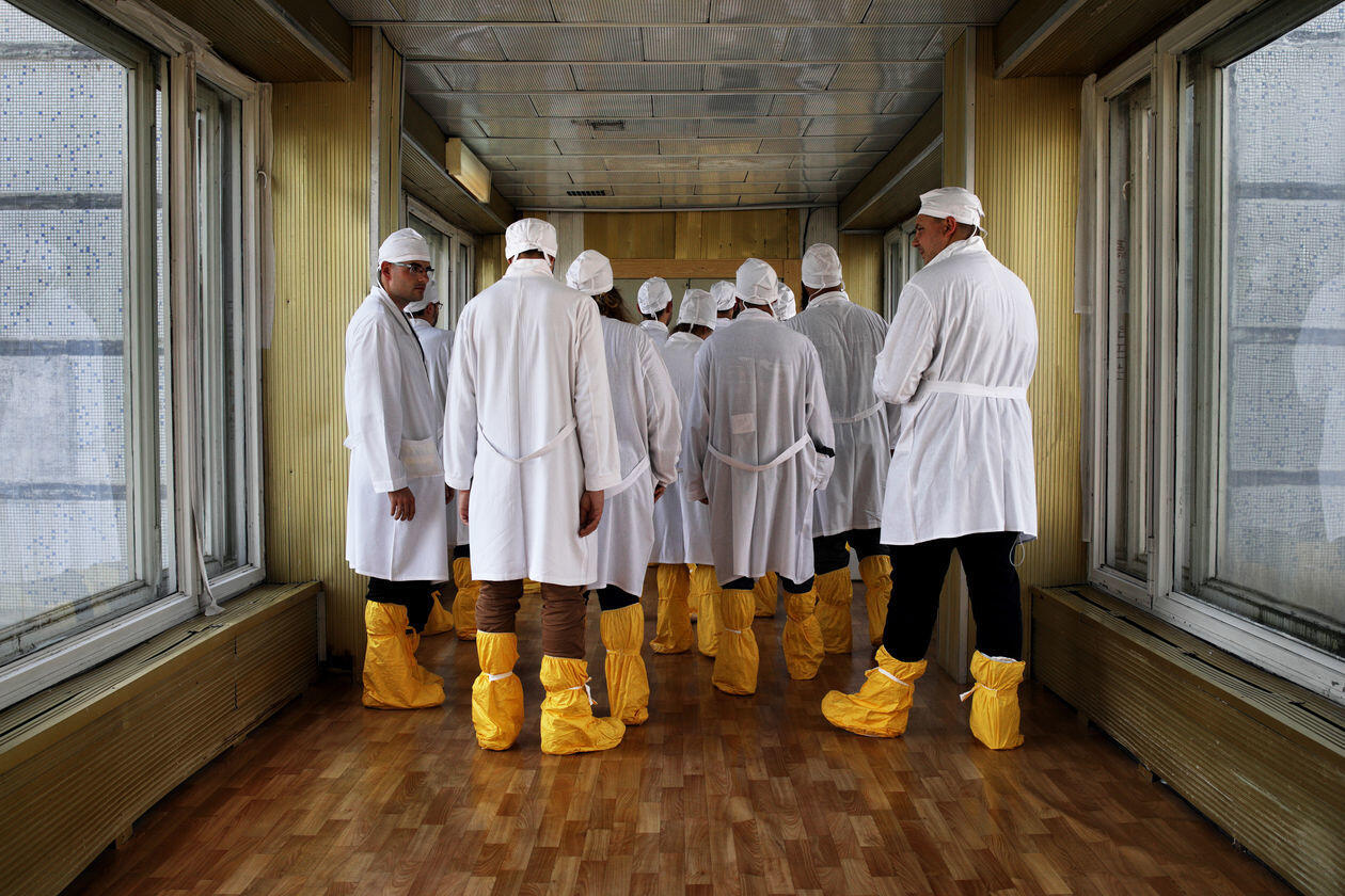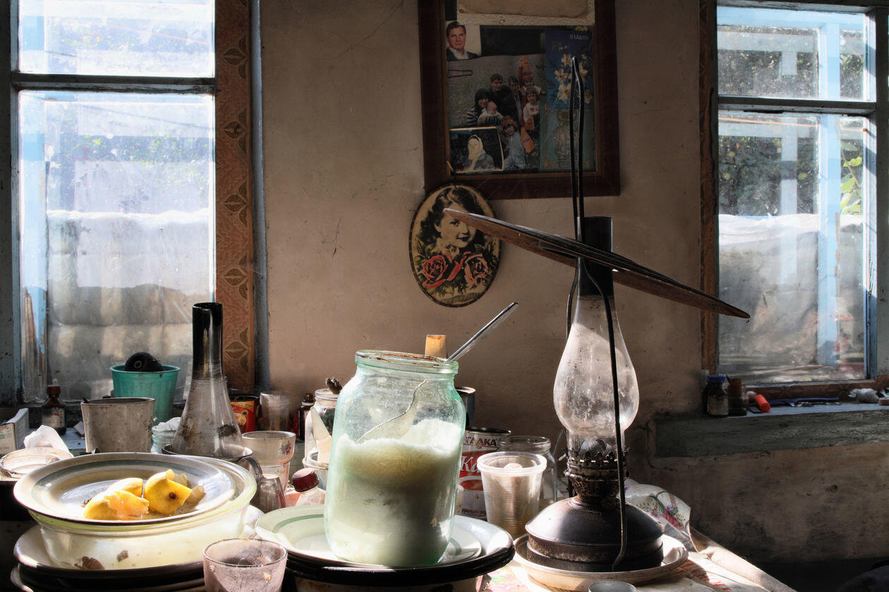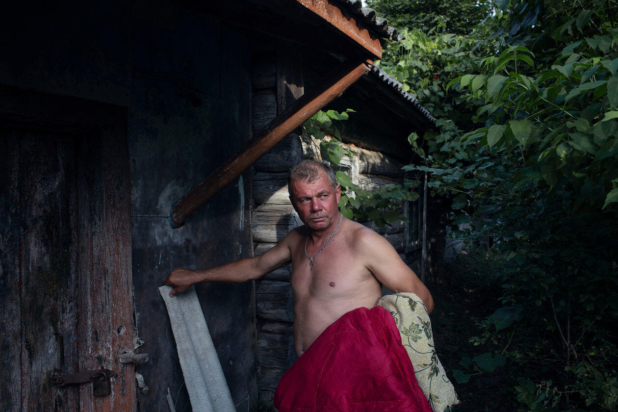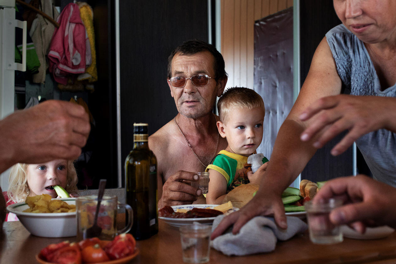 Ukraina. Życie codzienne mieszkańców zamkniętej strefy Czarnobyla i okolic. Szacuje się, że w wioskach tej strefy na stałe mieszka kilkadziesiąt osób. Bez bieżącej wody, większość bez prądu. Żyją z dala od cywilizacji, choć mieszkają w centrum światowej mapy „czarnej turystyki”. Na zdjęciach kolejno: 1) Maria Prakopowna Zagorna pracuje w polu. Jej pies Mucha zawsze jej towarzyszy. Kupowate skupia największą grupę samosiołów – mieszkańców strefy. Jest tu ich 16, w tym 14 kobiet. 2) Stół w domu Olgi Juschenko, jedynej mieszkanki wioski Łubianka. 3) Wiktoria, Wiktor, Sasza i Nadieżda przyjmują gości w swoim domu nieopodal granicy strefy. Wiktor, który w ten sposób obchodzi swoje urodziny, na co dzień pracuje jako strażnik przy 5. bloku elektrowni, gdzie spotyka grupy turystów. 4) Roman, strażak z zamkniętej strefy Czarnobyla, ćwiczy w swojej siłowni na terenie remizy. Pies Fredia nie odstępuje go na krok. 5) Hanna Aleksiejewa Zaworotna nabiera wodę ze swojej studni. 6) Sonia Romanowa ogląda telewizję w swoim domu we wsi Kupowate. 7) Grupa turystów wchodzi do elektrowni atomowej w Czarnobylu. 8) Siergiej jest przewodnikiem po zamkniętej strefie. Mieszka we wsi Orane. Regularnie odwiedza wieś Kupowate, by pomóc je mieszkańcom w cięższych pracach fizycznych.