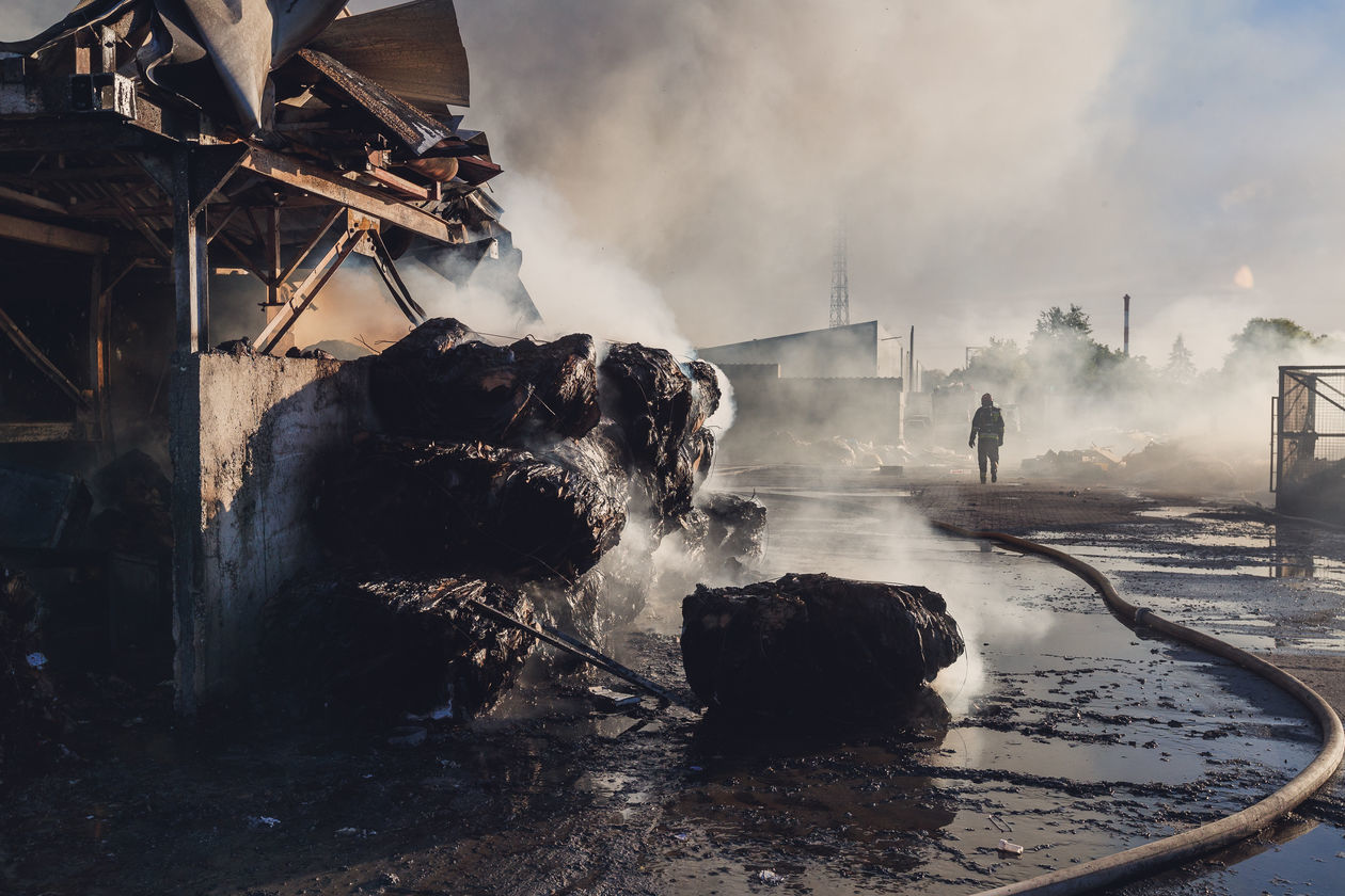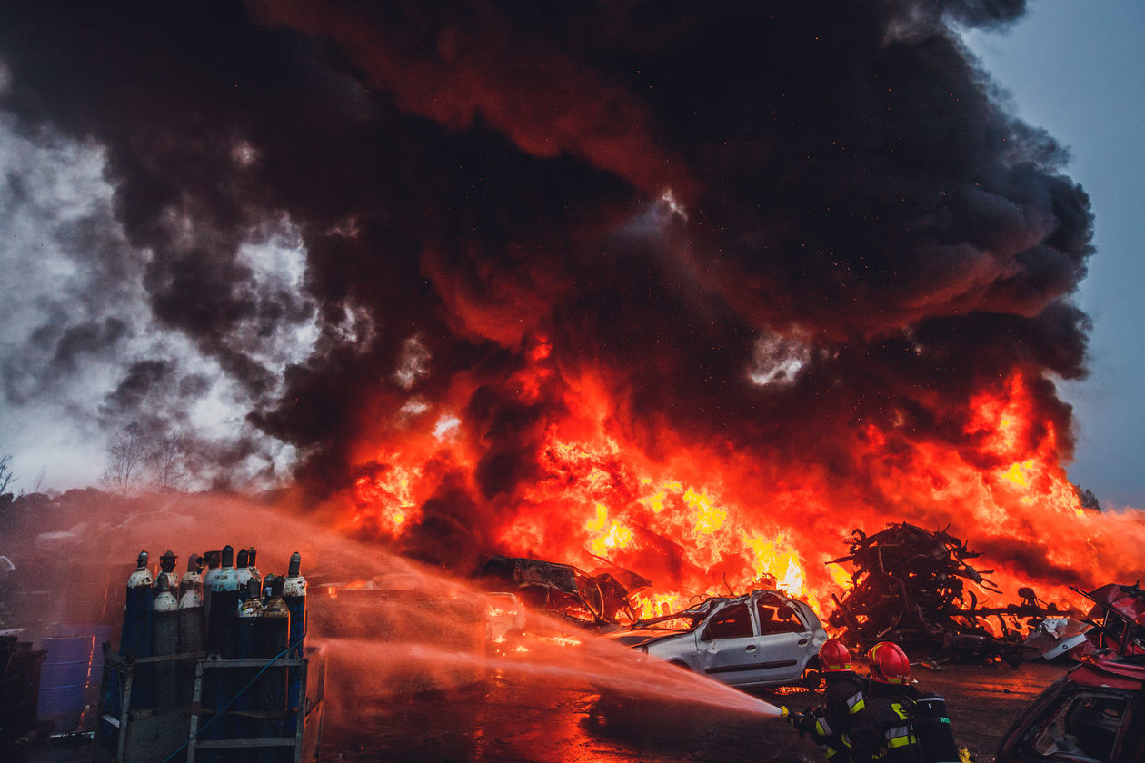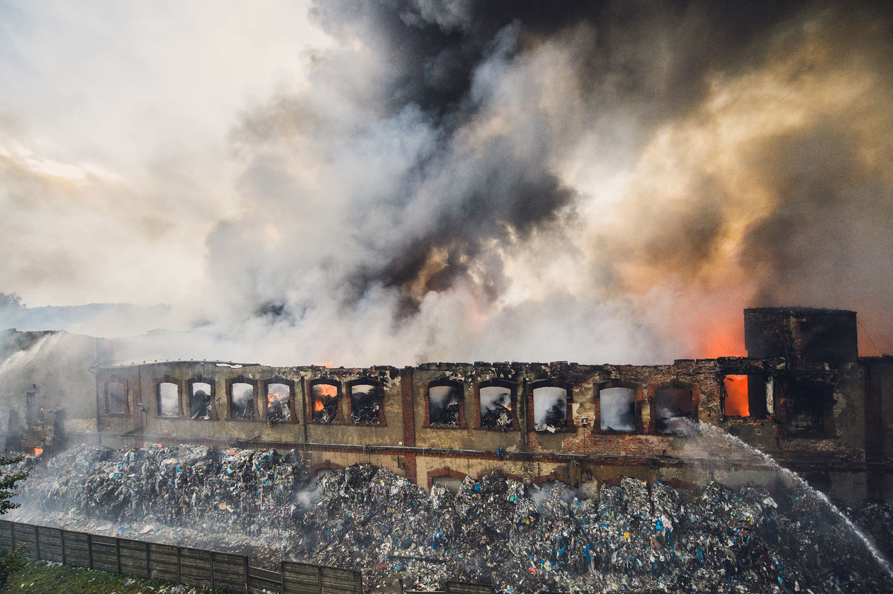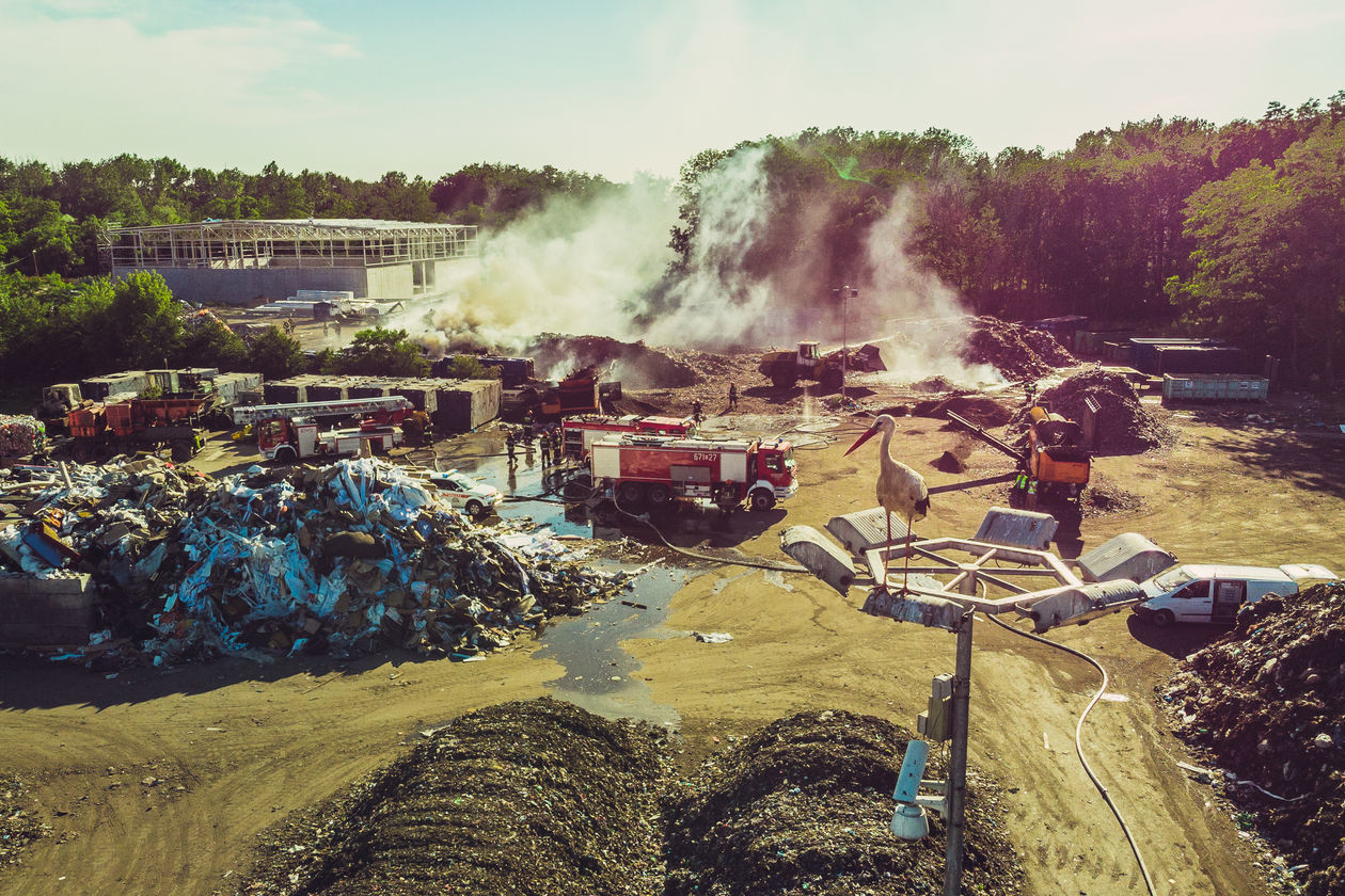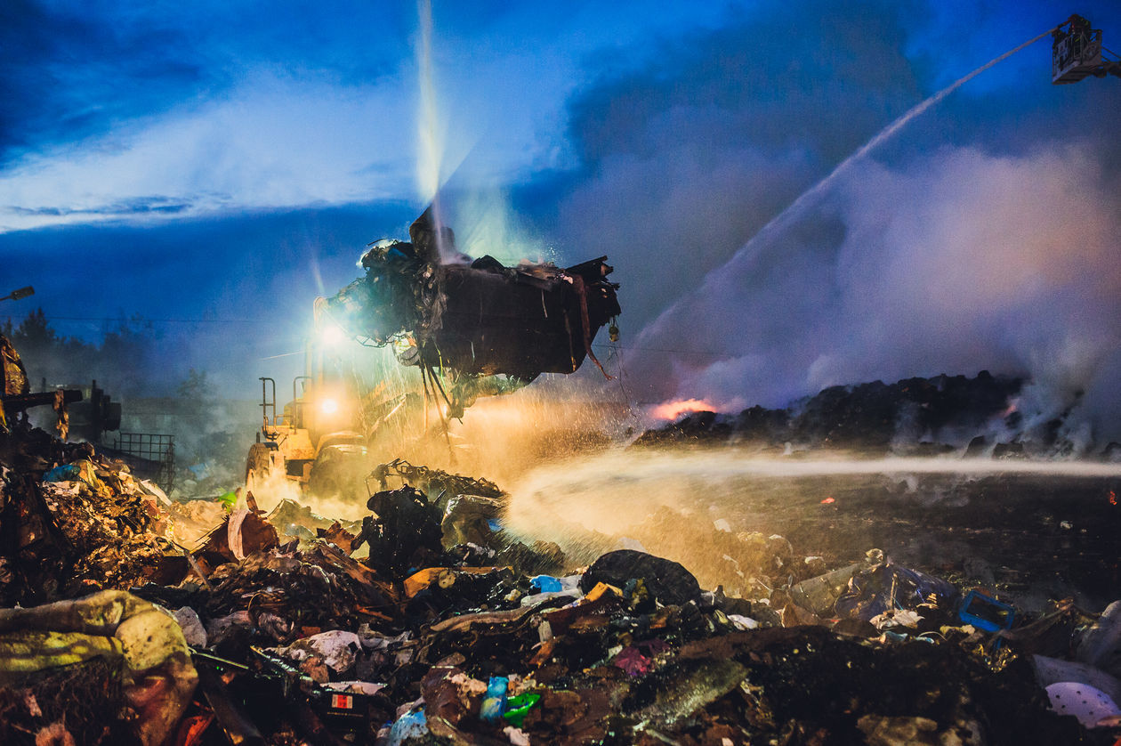 „Śmieci w chmurze” – działania strażaków w woj. śląskim i małopolskim na terenie sortowni, wysypisk śmieci, magazynów z chemikaliami i punktów recyklingu. Na zdjęciach kolejno: 1) Siemianowice Śląskie – sortownia śmieci. 2) Klucze – sortownia śmieci. 3) Piekary Śląskie – skład makulatury. 4) Tarnowskie Góry – punkt recyklingu pojazdów. 5) Żywiec – magazyn z chemikaliami. 6) Siemianowice Śląskie – sortownia śmieci. 7) Zabrze – sortownia śmieci. 8) Piekary Śląskie – skład makulatury.
