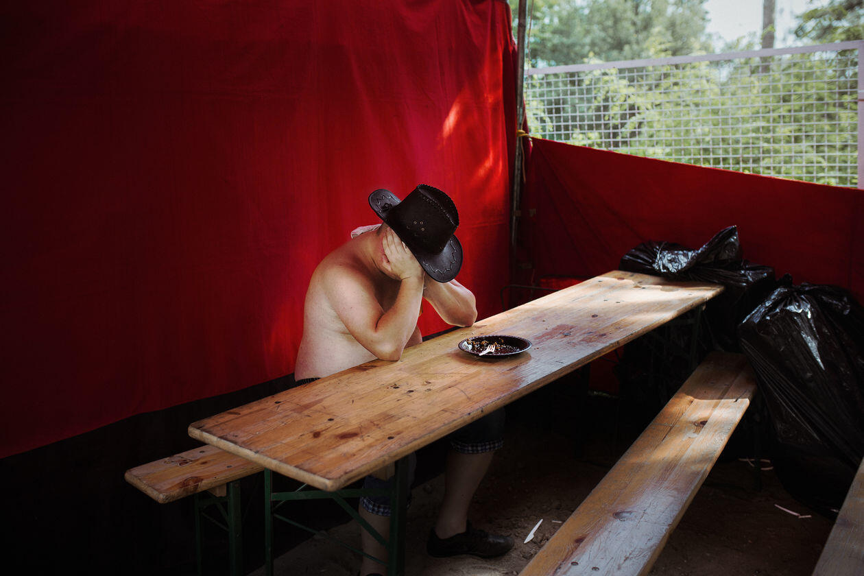 Piknik Country w Mrągowie. Na to muzyczne święto w północno-wschodnim rejonie Polski przyjeżdża co roku kilkadziesiąt tysięcy fanów i turystów. Festiwal powstał w 1981 roku, gdy kraj pogrążony był w komunizmie. Dla wielu stałych bywalców wydarzenia to sentymentalną podróż do czasów młodości, okresu antysystemowego buntu rodzącego pragnienie obcowania z zachodnią kulturą. Nowe pokolenia wielbicieli Dzikiego Zachodu w ciągu kilku dni mają okazję ubrać kowbojskie stroje, dosiąść konia i poczuć klimat westernu dopełniony muzyką country. Na zdjęciach kolejno: 1) Koncerty w amfiteatrze zaczynają się tuż po zachodzie słońca. 2) Plaża miejska nad jeziorem Czos. 3) Turyści zaopatrują się w różne akcesoria i ubrania zainspirowane kulturą Dzikiego Zachodu. 4) W okolicy amfiteatru na czas festiwalu rozstawiono stragany z akcesoriami i jedzeniem. 5) Mężczyzna śpiący w sektorze gastronomicznym. 6) Konie dostępne jako atrakcja turystyczna.