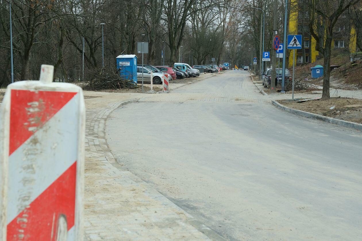 Pierwotnie termin zakończenia robót był ustalony na 31 października, ale Ratusz zmienił go na 30 listopada, co oznacza, że wczoraj ulica powinna być już gotowa. Nie była, choć do zrobienia nie pozostało już zbyt wiele. Na jezdni jest już nowy asfalt, a studzienki zgrywają się z poziomem nawierzchni. Po układaniu asfaltu pozostał wciąż znak drogowy zakazujący parkowania, także w zatokach postojowych, pod groźbą odholowania pojazdu. Zakaz wydaje się już zbędny, zresztą kierowcy już kompletnie się nim nie przejmują. Wykonawca prac nie zdążył jeszcze zdemontować starych, betonowych latarni. Jedna z nich wyrasta dziś ze środka zatoki parkingowej. Do wywiezienia pozostały też sterty gałęzi, kupa piachu, a gdzieniegdzie konieczne będą jeszcze prace brukarskie.