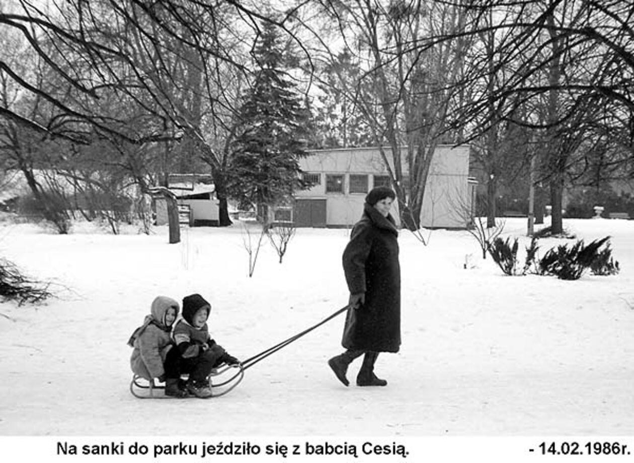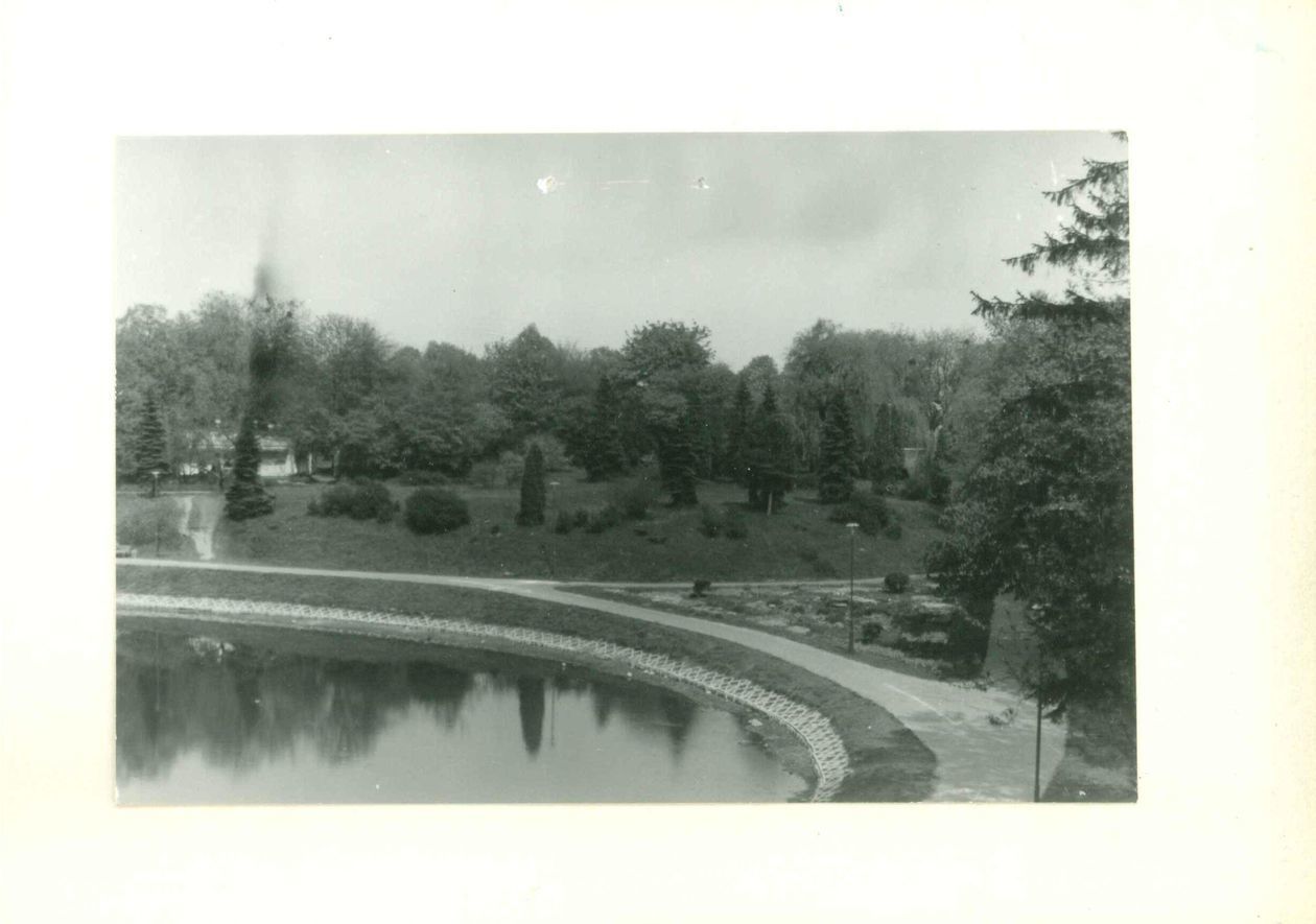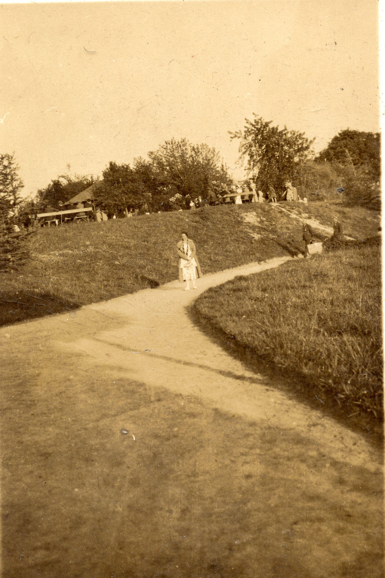 Fotografię z ok. 1930 r. - na drugim planie widoczny fragment cukierni parkowej oraz ludzi siedzących na ławkach wokół budynku
