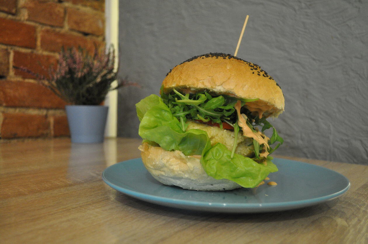 Kotlety z boczniaków czy szpinakowo–jaglane oraz pulpety falaflowe z curry zjemy z ziemniakami, ryżem lub kaszą. Są też pierogi: ruskie, ze szpinakiem. Neapolitańskie spaghetti, lasagne z warzyw, burrito, falafel i burgery. Tych ostatnich nie polecam. Kotlet marchewkowy niemal od razu “wypłynął” z bułki.