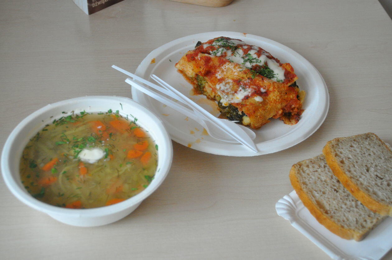 Klasyczna domowa kuchnia w wersji wegańskiej lub wegetariańskiej. Codziennie nowe zupy. Jedna lub dwie. Za 5 złotych można zjeść pomidorową czy barszcz ukraiński. Za 8 – zestaw obiadowy, czyli panierowane kotlety sojowe, do których wybieramy ziemniaki z cebulką czy brązowy ryż bądź kaszę oblane sosami – pomidorowym lub curry. Do tego surówka lub buraczki.