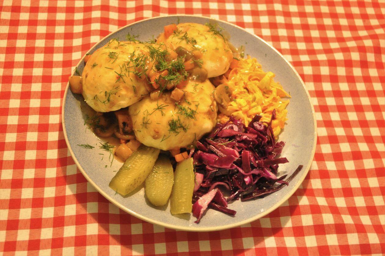 Kucharzowi nie brakuje finezji. Na przystawkę – tatar z suszonych pomidorów, zupa – flaki z boczniaka, a zamiast kawy – kurkuma latte. Do obiadu klasycznie – kieliszek wina lub kufel piwa, jak kto woli.