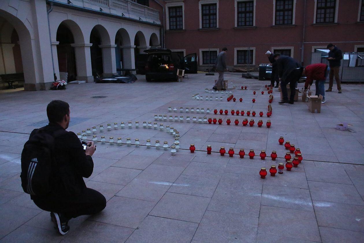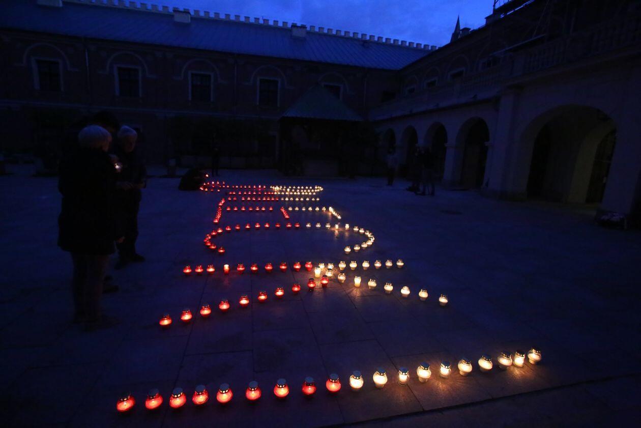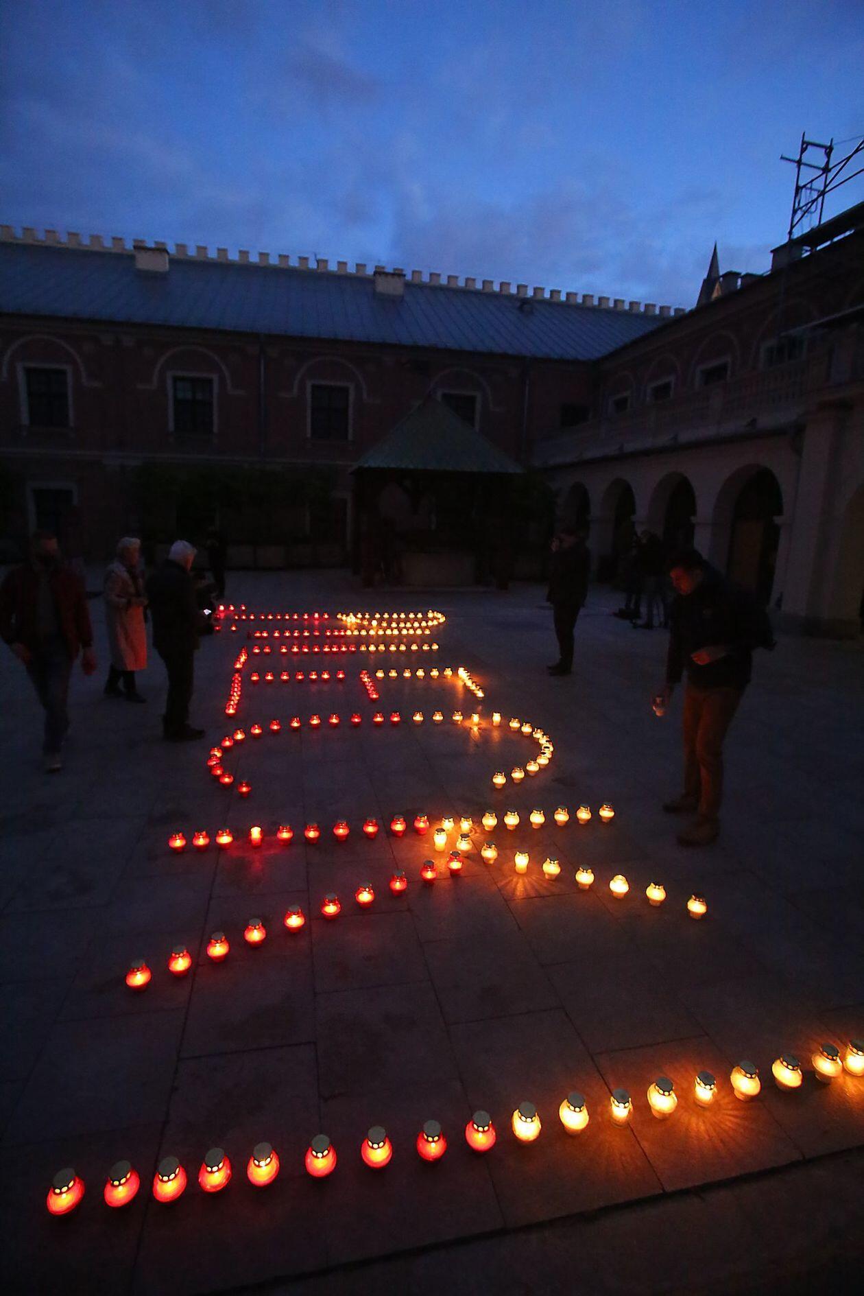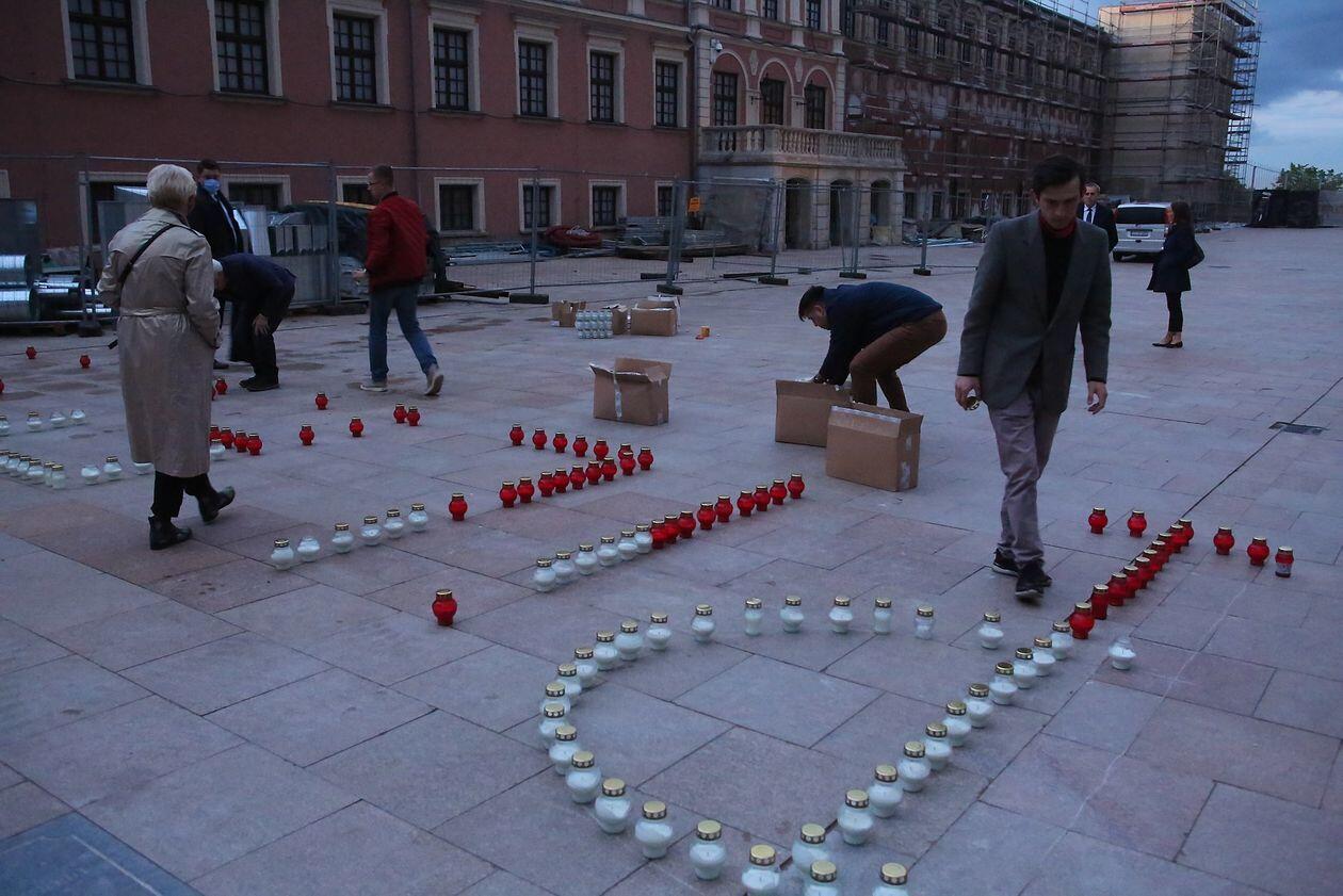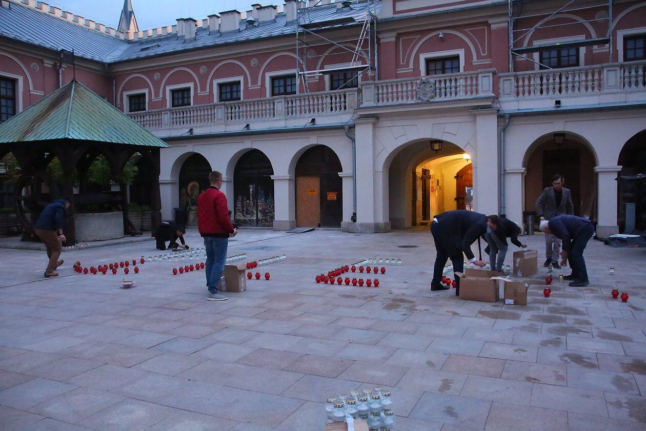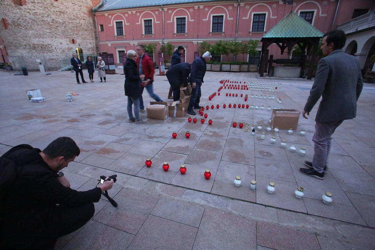 PILECKI - napis z biało-czerwonych zniczy na dziedzińcu Zamku Lubelskiego