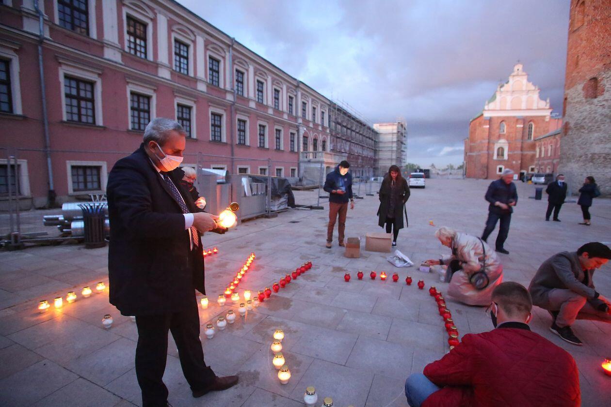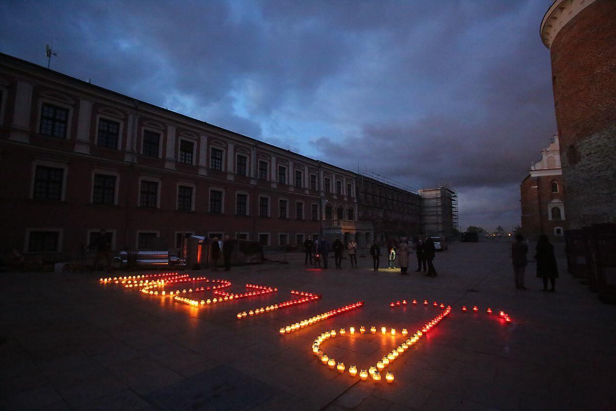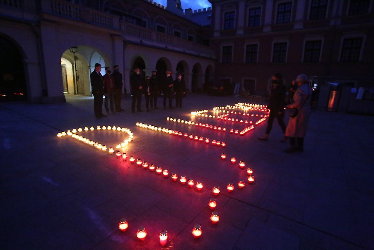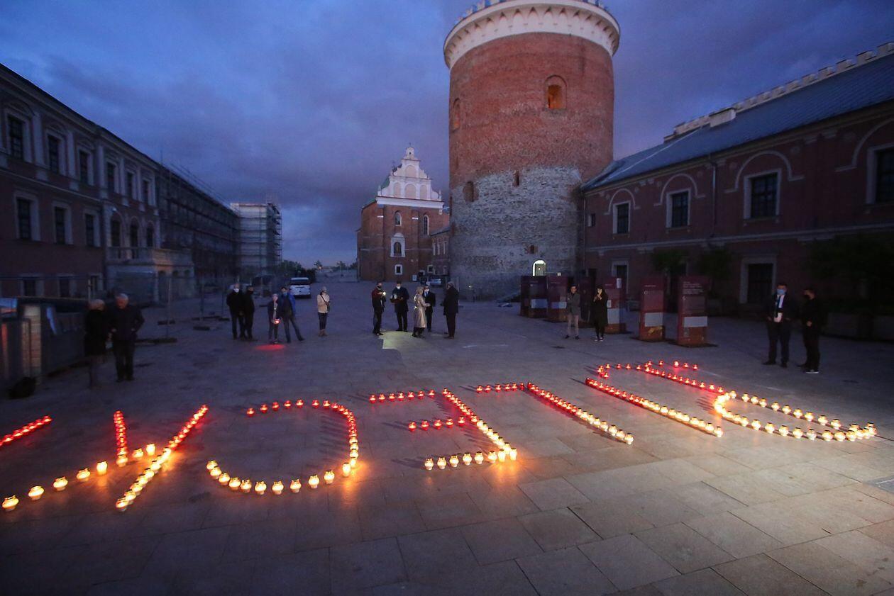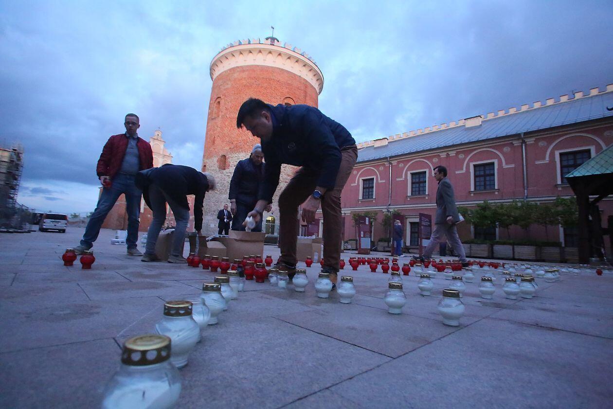 PILECKI - napis z biało-czerwonych zniczy na dziedzińcu Zamku Lubelskiego