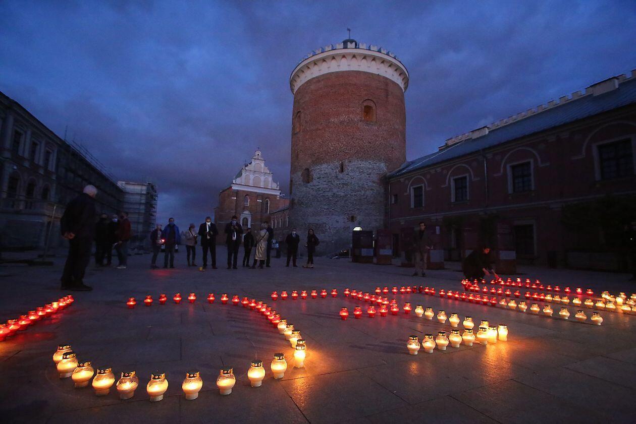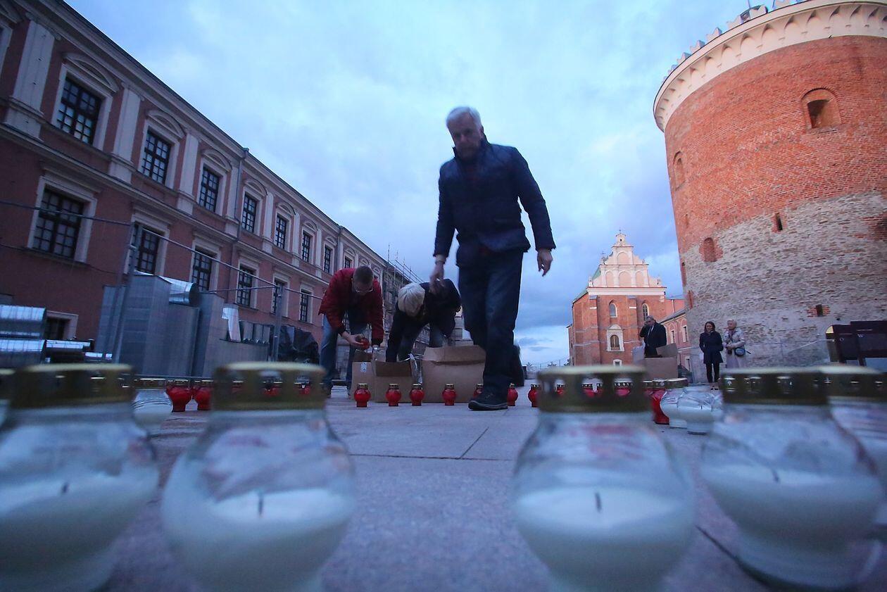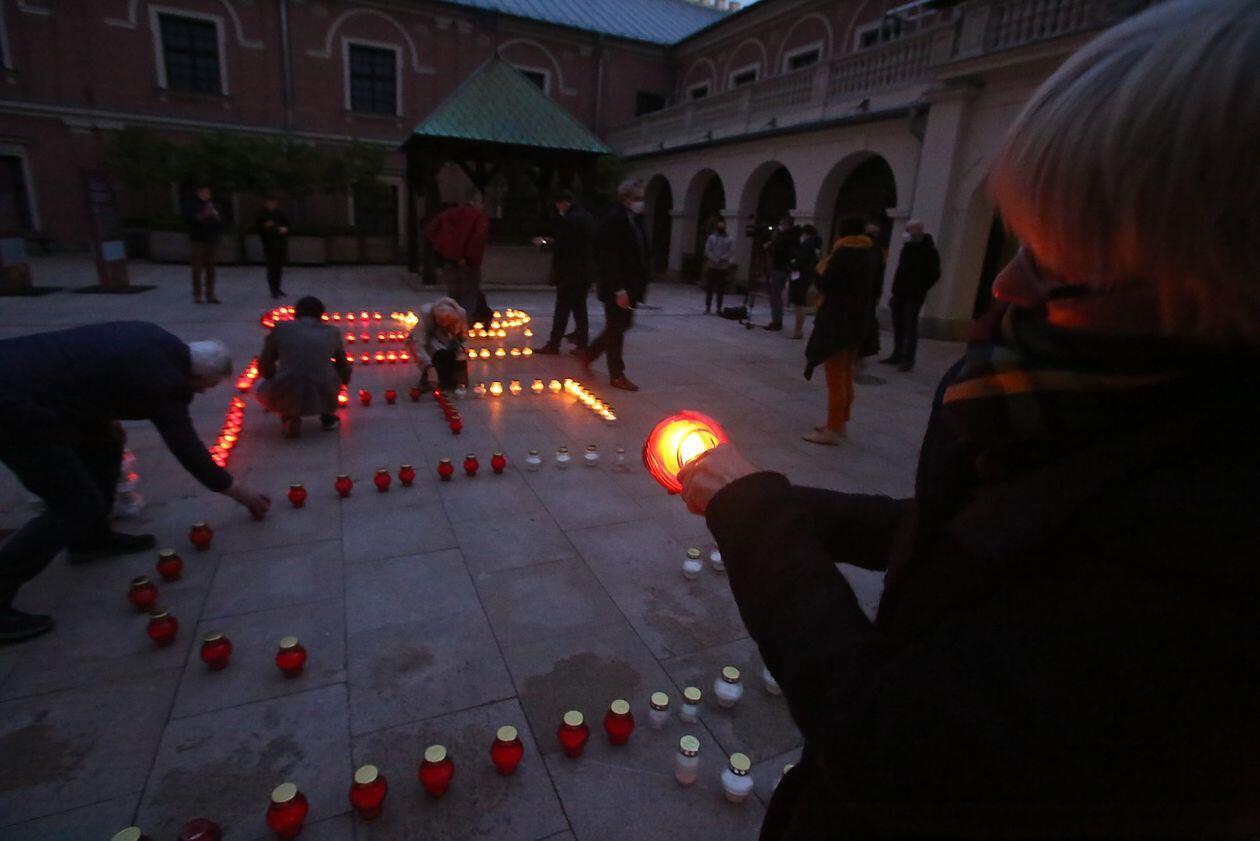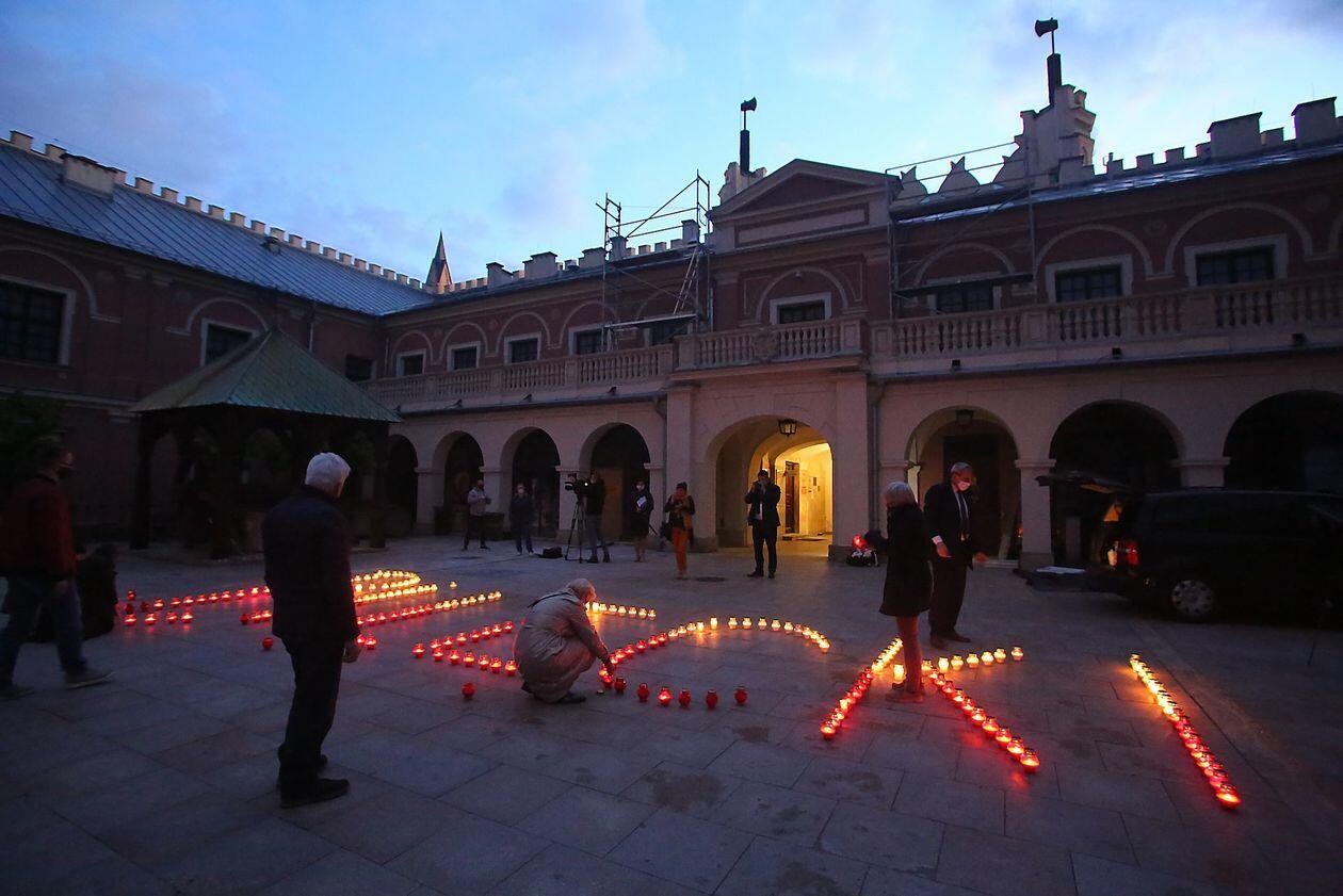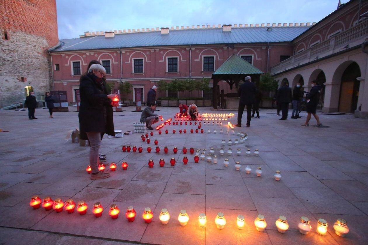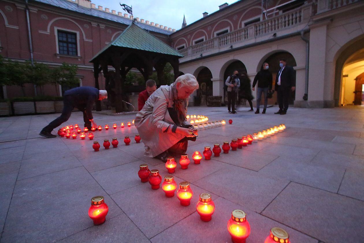PILECKI - napis z biało-czerwonych zniczy na dziedzińcu Zamku Lubelskiego