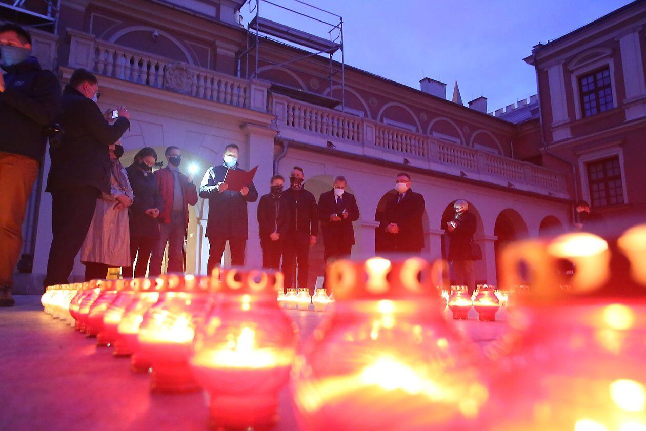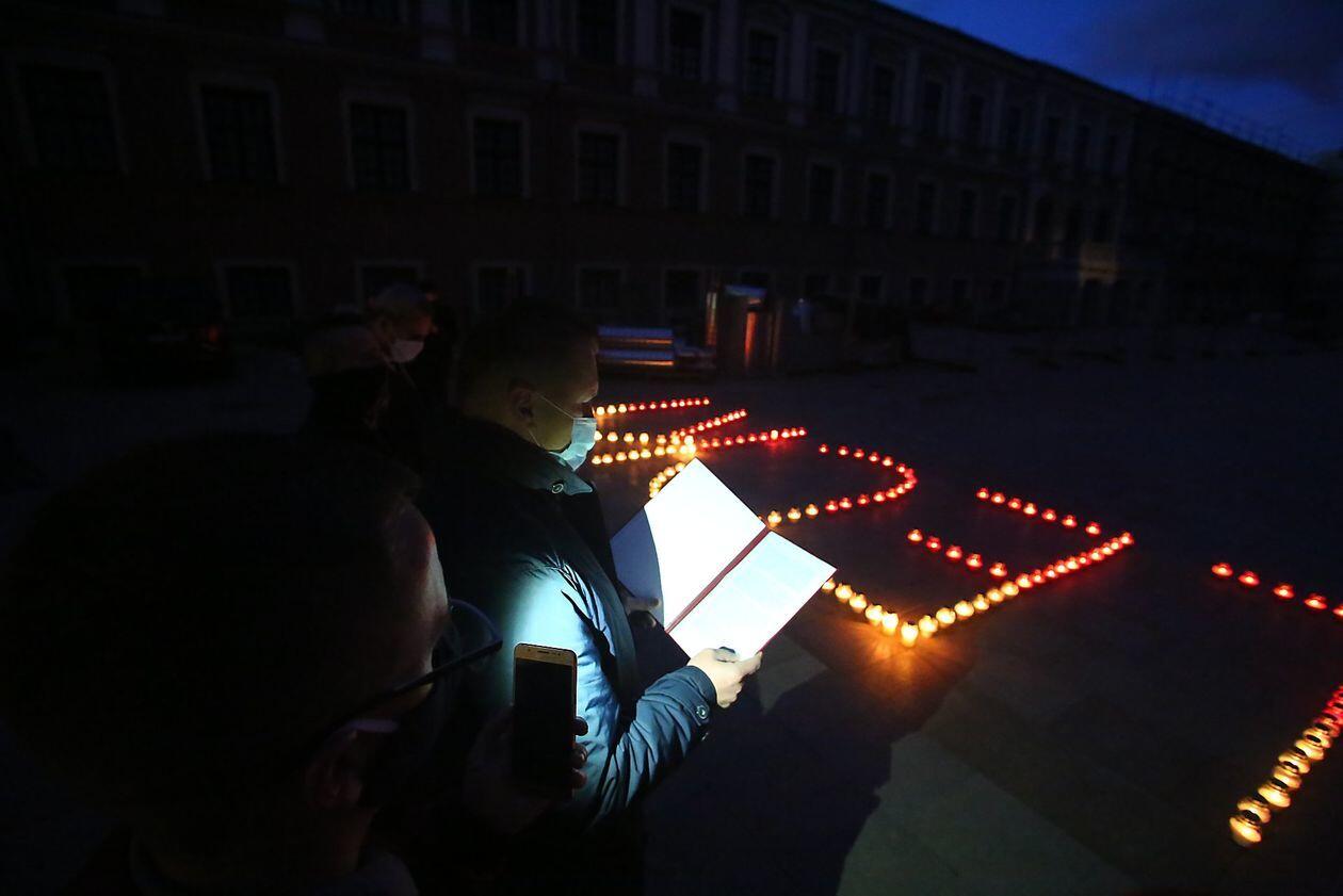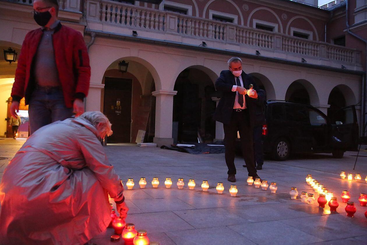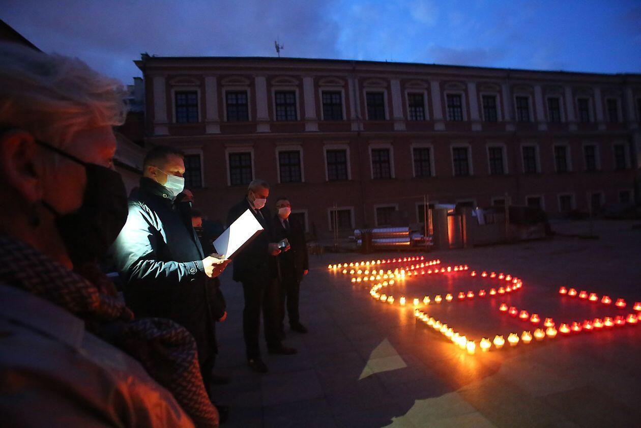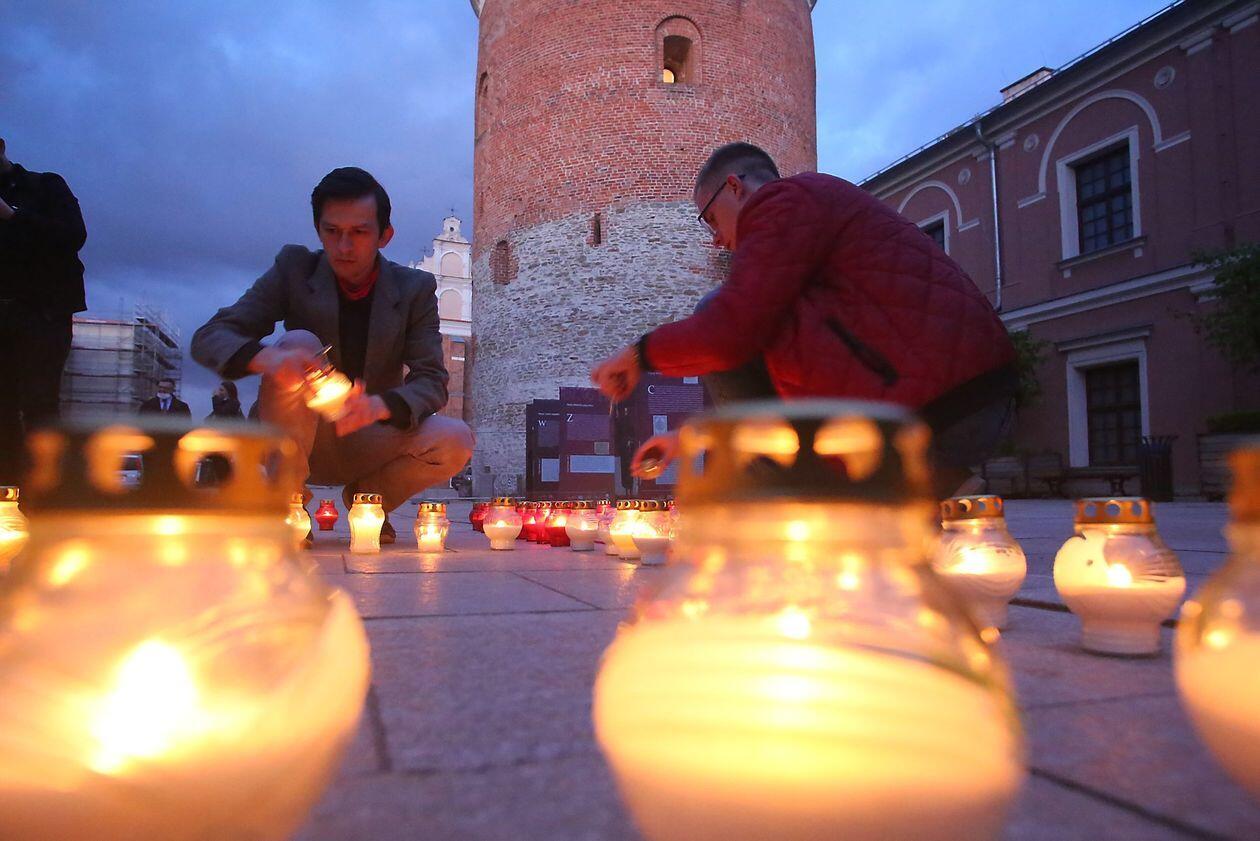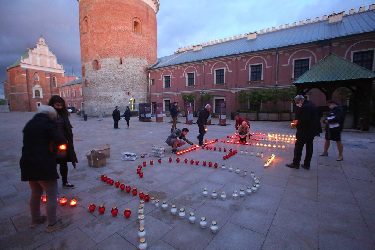 PILECKI - napis z biało-czerwonych zniczy na dziedzińcu Zamku Lubelskiego