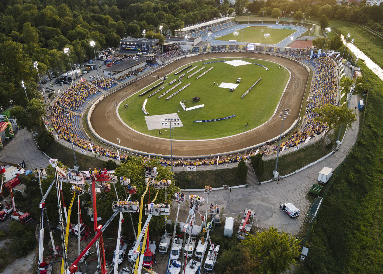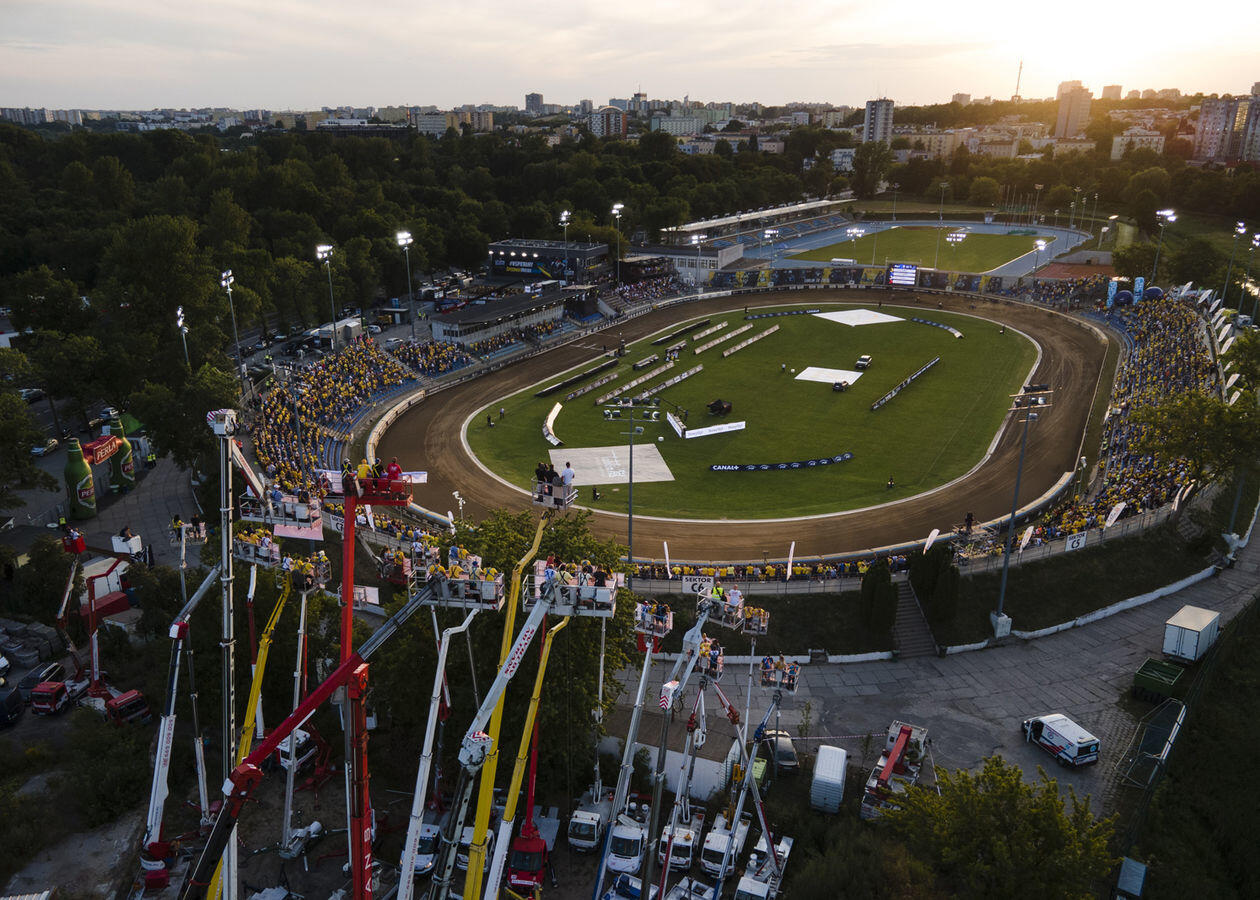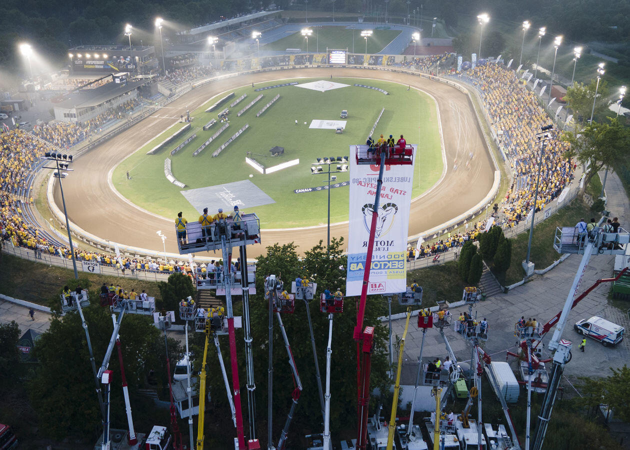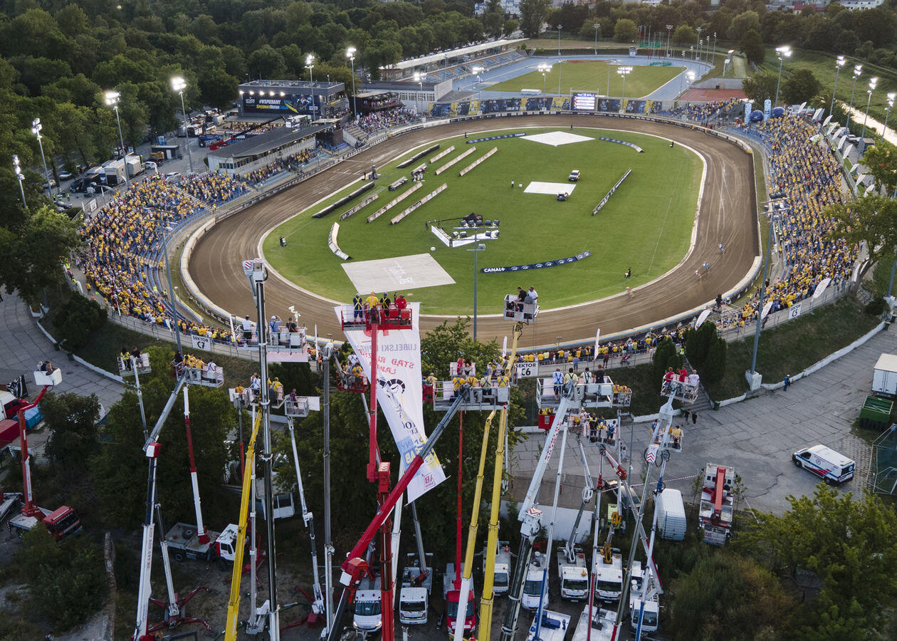 Mecz 8. kolejki żużlowej Ekstraligi. Kibice obserwują rywalizację zawodników z "trybuny" na wysięgnikach.