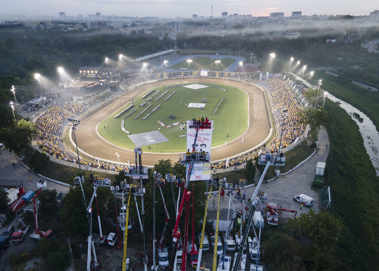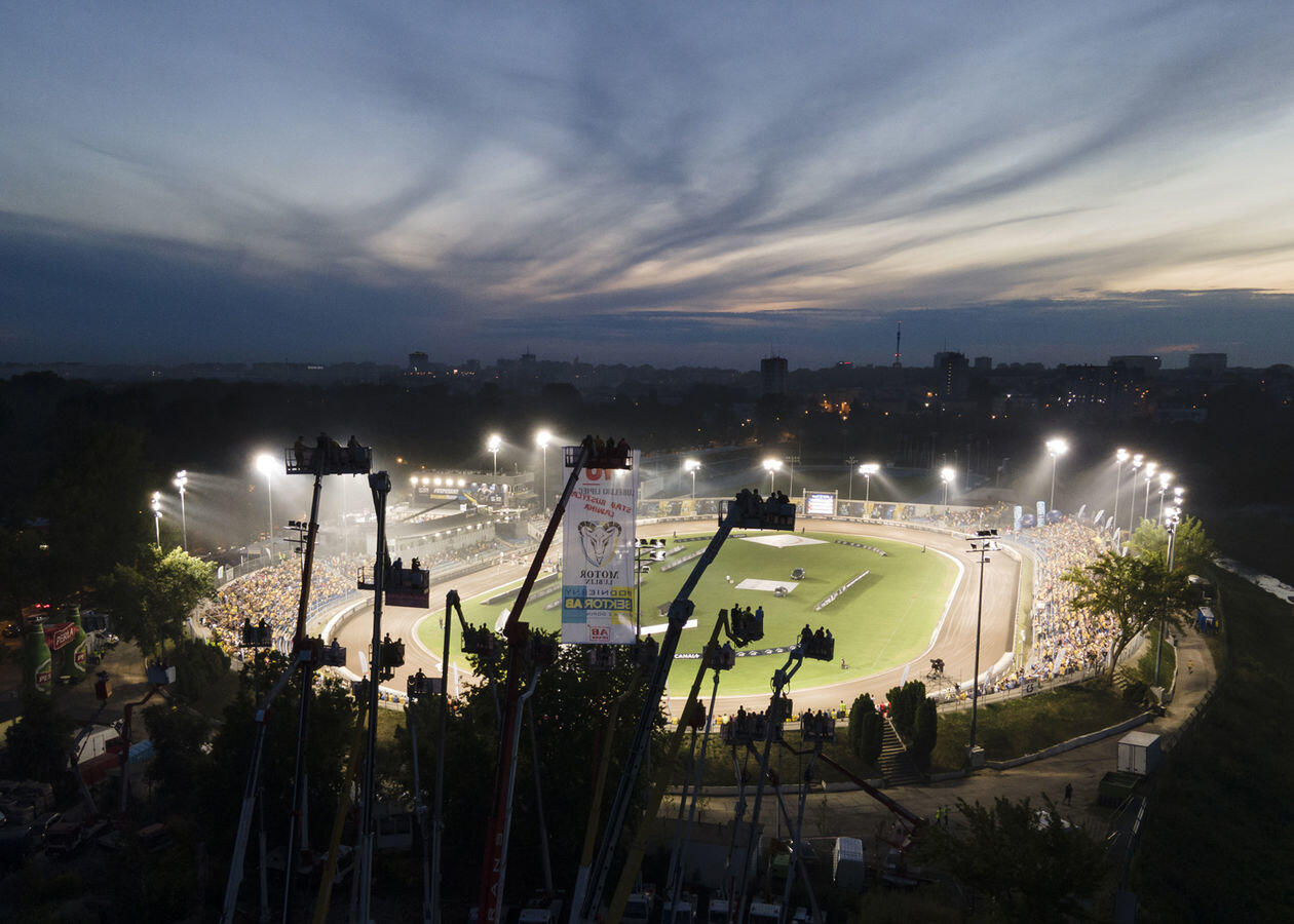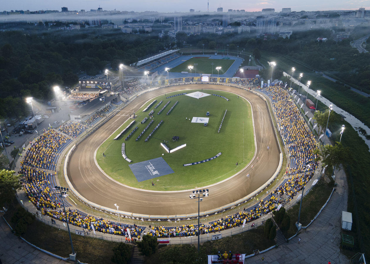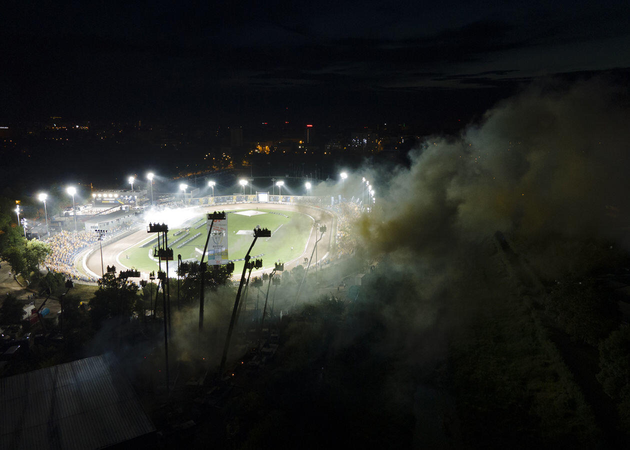 Mecz 8. kolejki żużlowej Ekstraligi. Kibice obserwują rywalizację zawodników z "trybuny" na wysięgnikach.