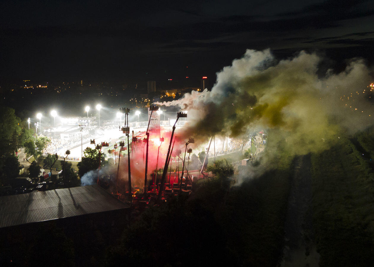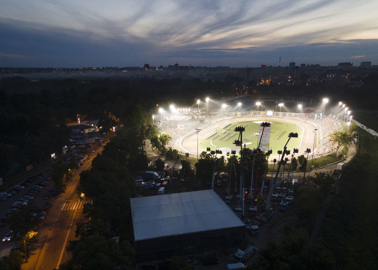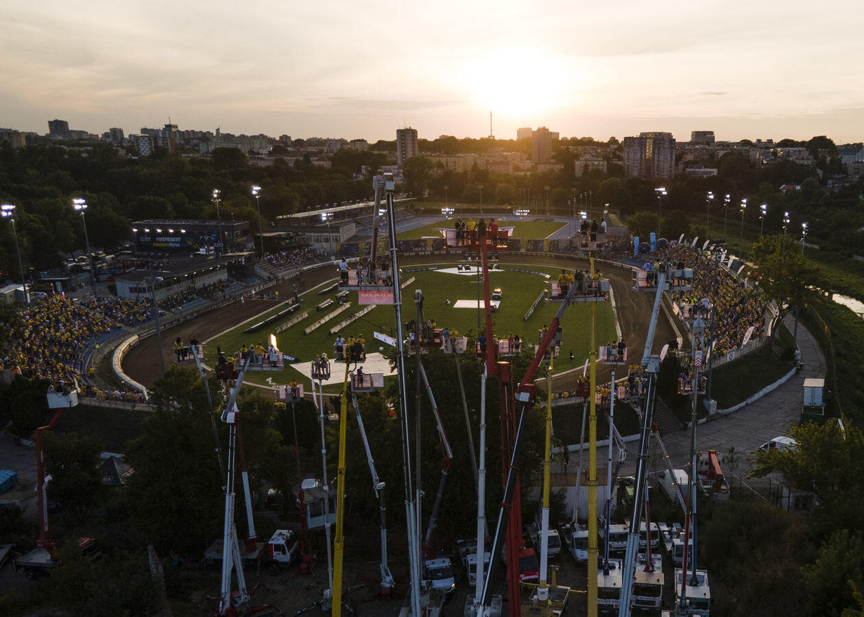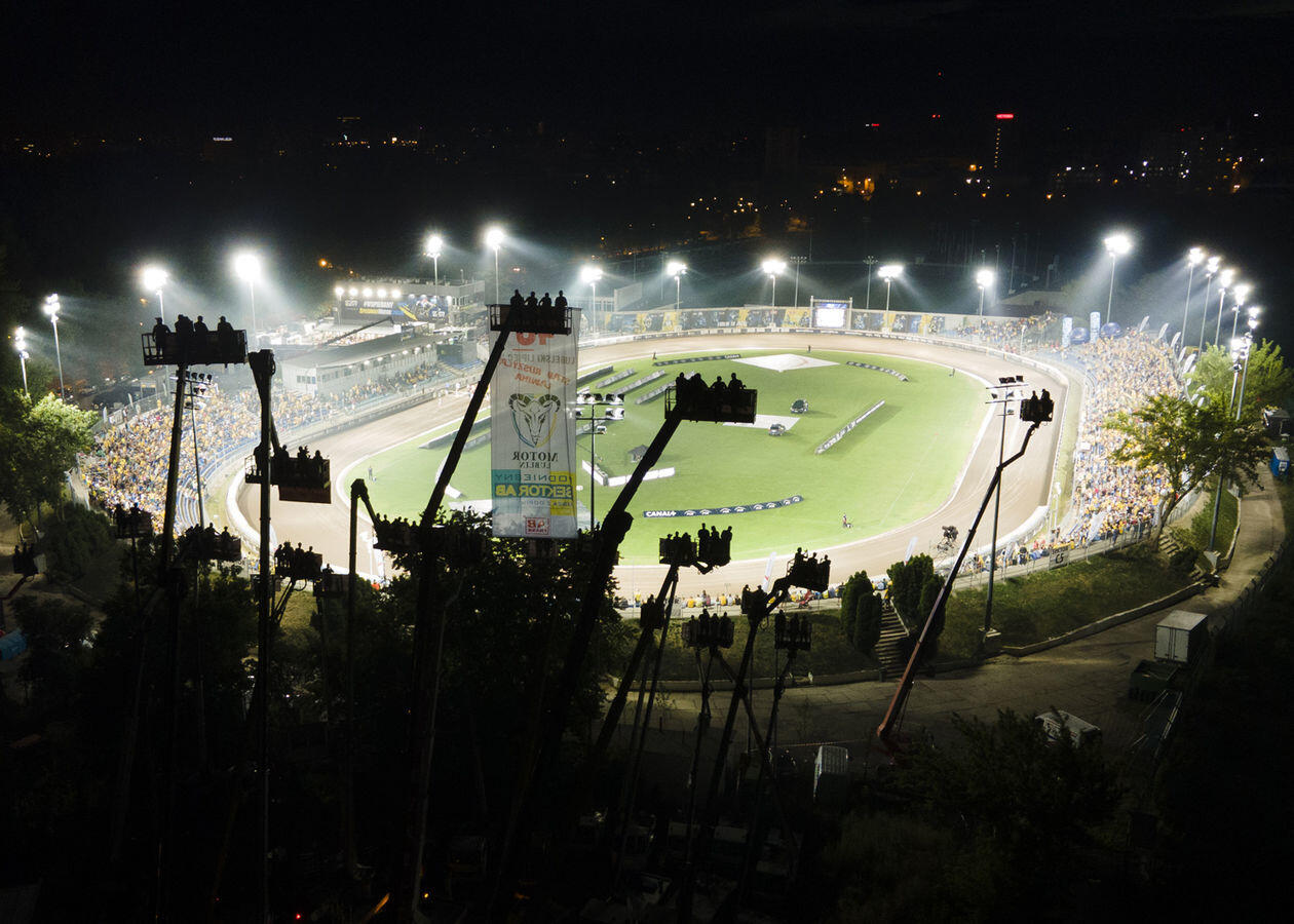 Mecz 8. kolejki żużlowej Ekstraligi. Kibice obserwują rywalizację zawodników z "trybuny" na wysięgnikach.