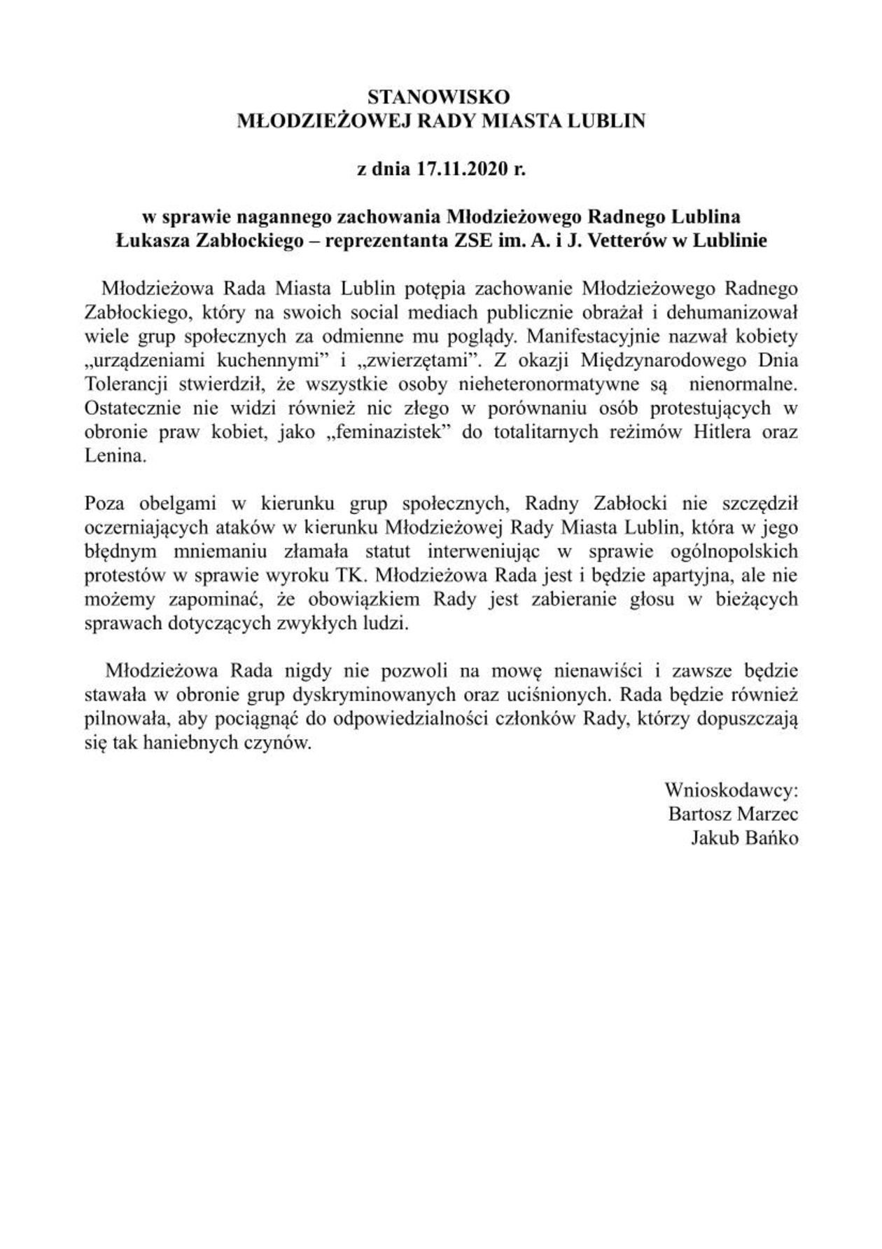 Prezydium Młodzieżowej Rady Miasta skrytykowało w środę wpisy radnego Łukasza Zabłockiego