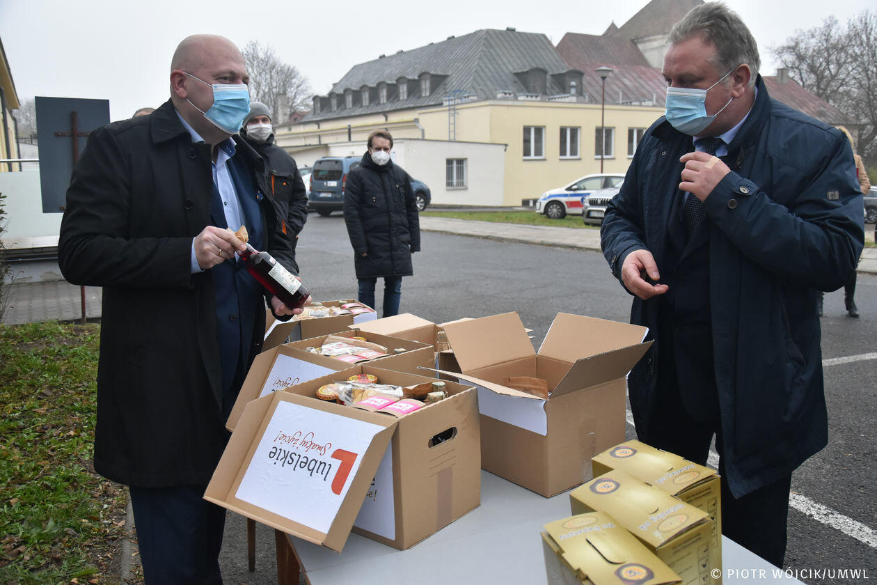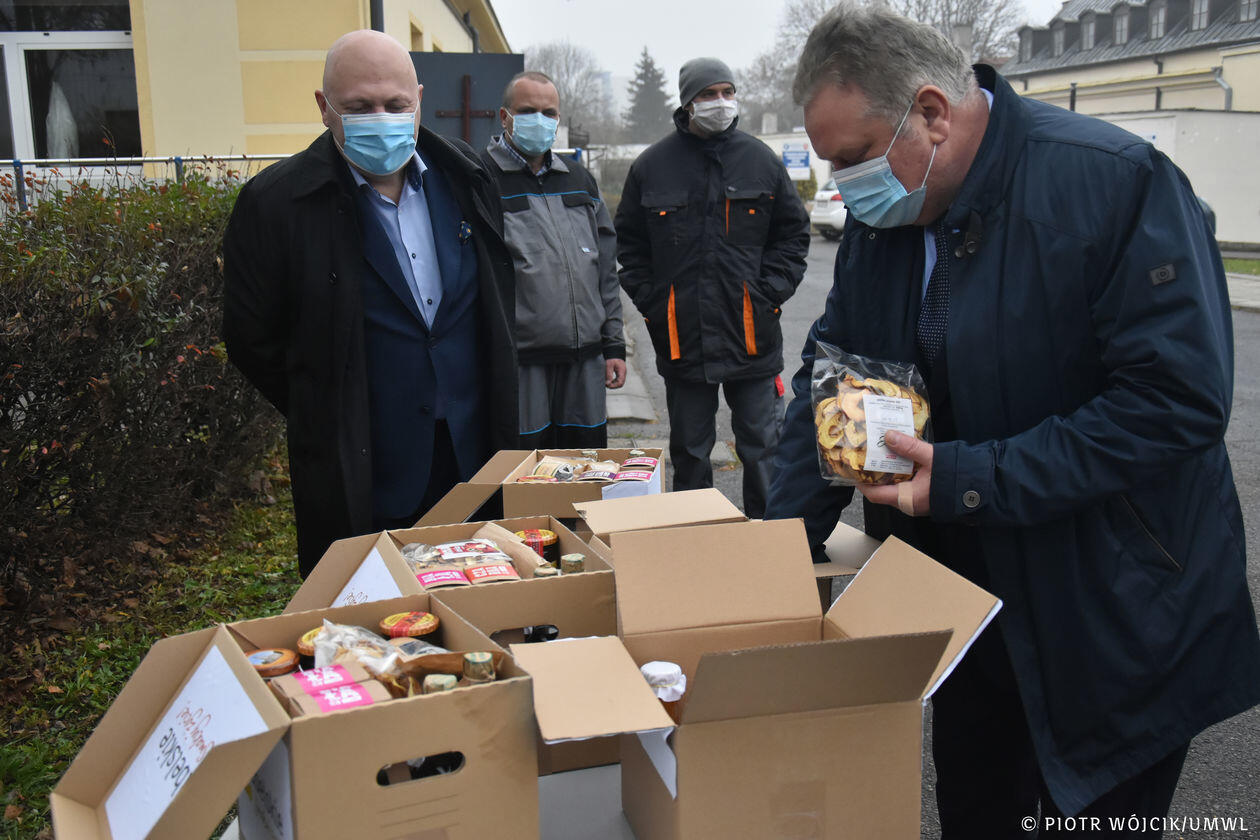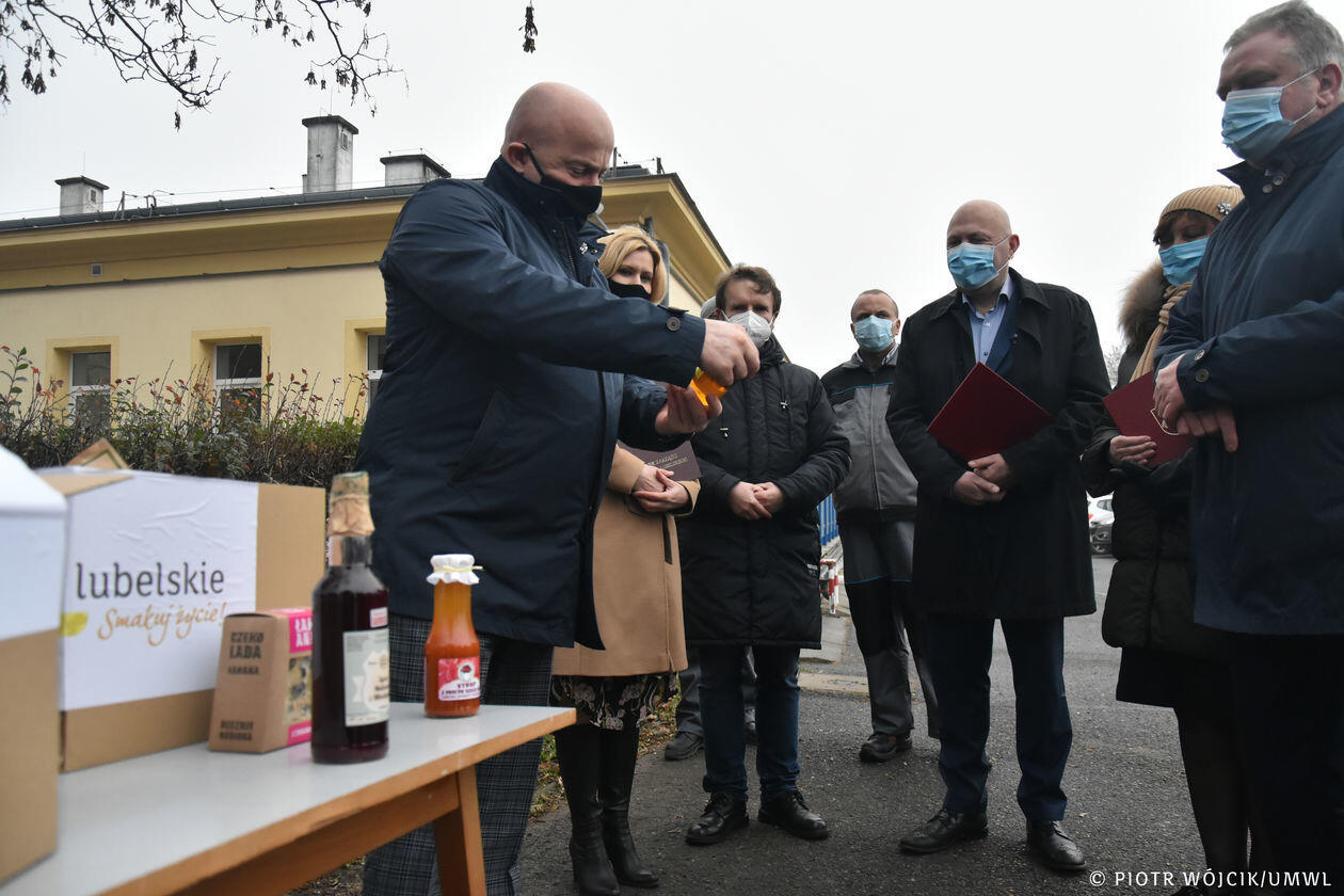 Marszałek województwa przekazuje produkty regionalne medykom