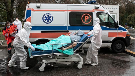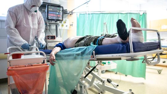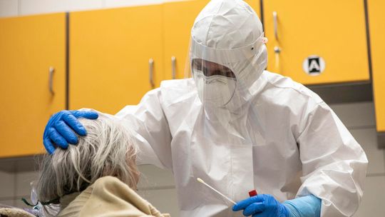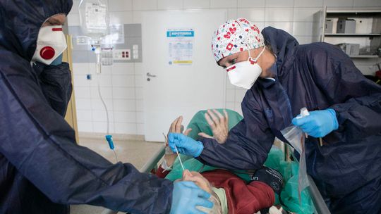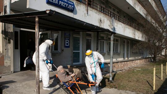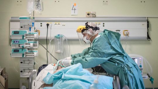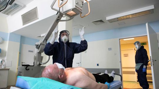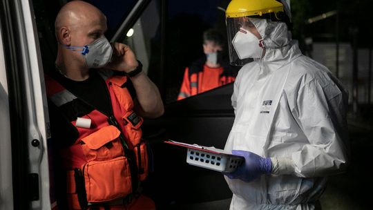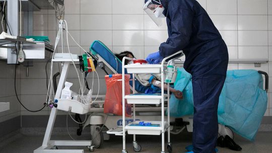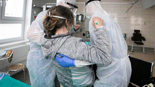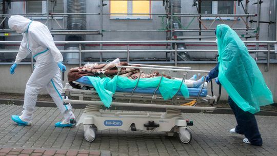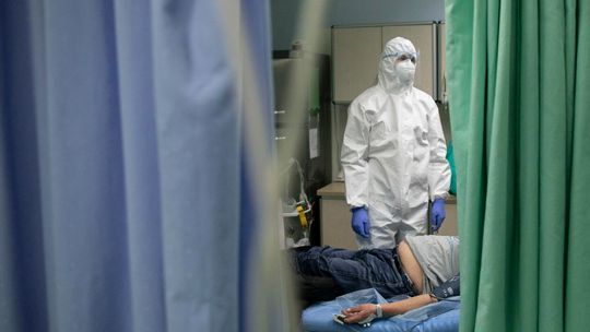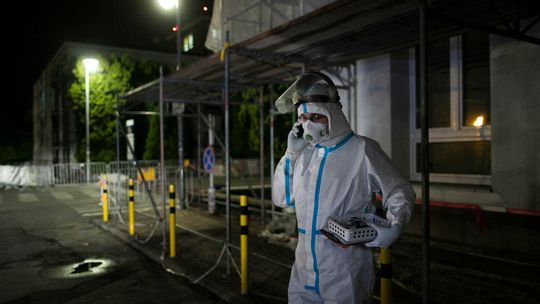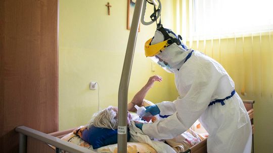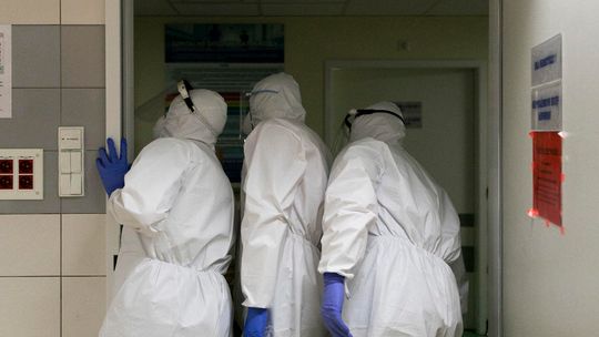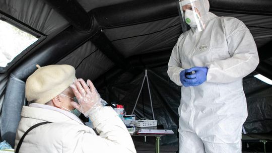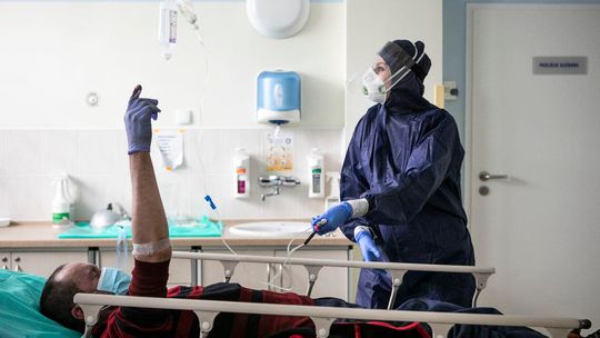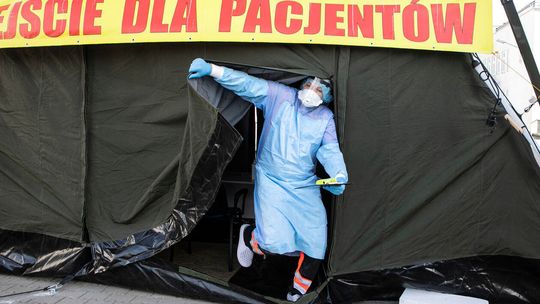 Pielęgniarka w namiocie do segragacji pacjentów przed Szpitalem Klinicznym Nr 4 w Lublinie.