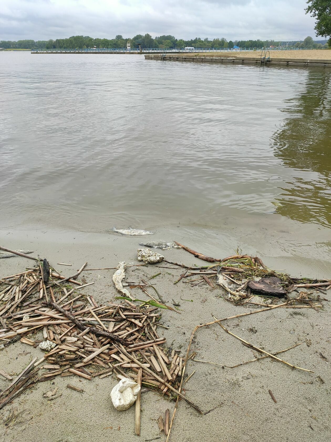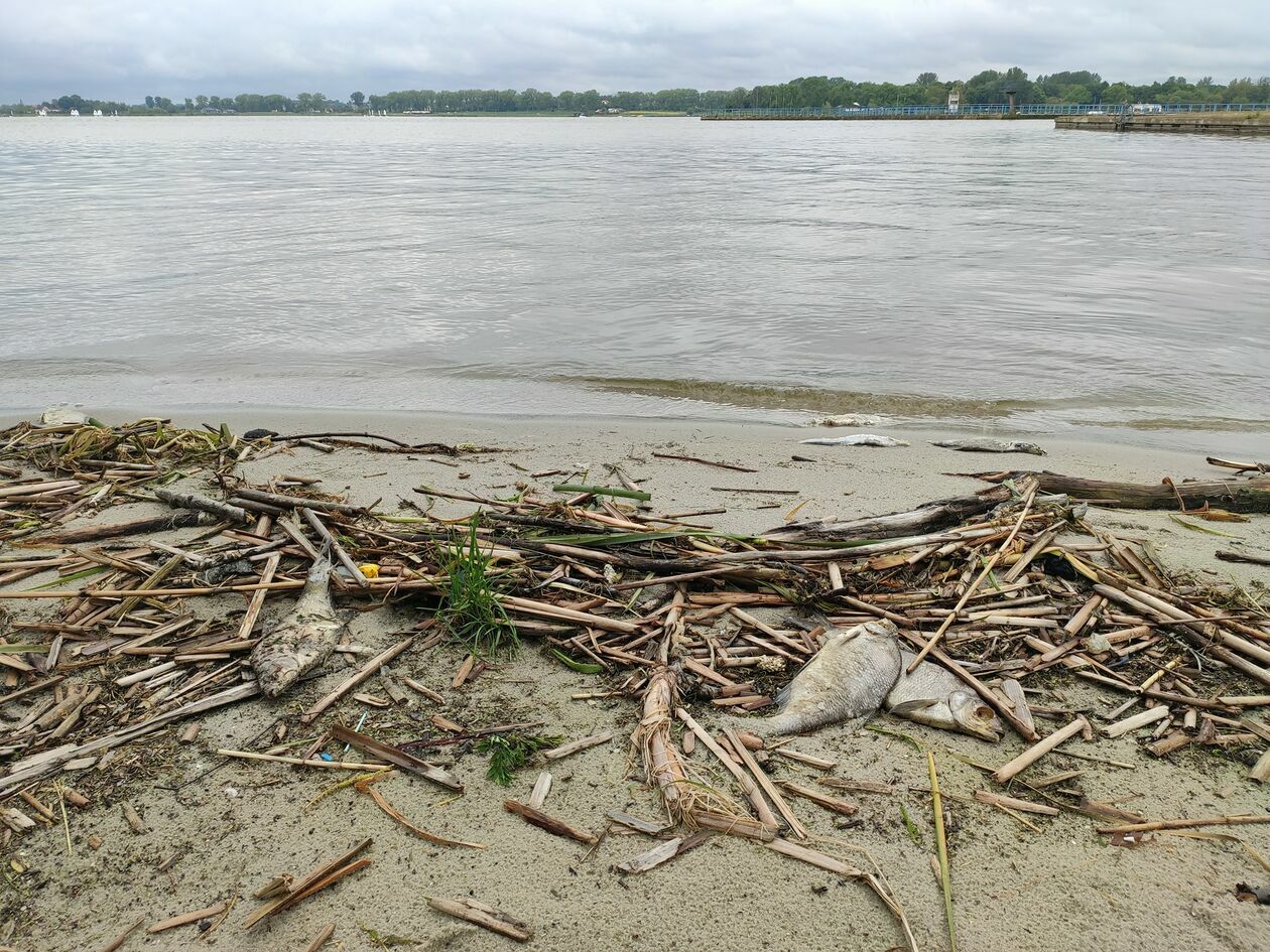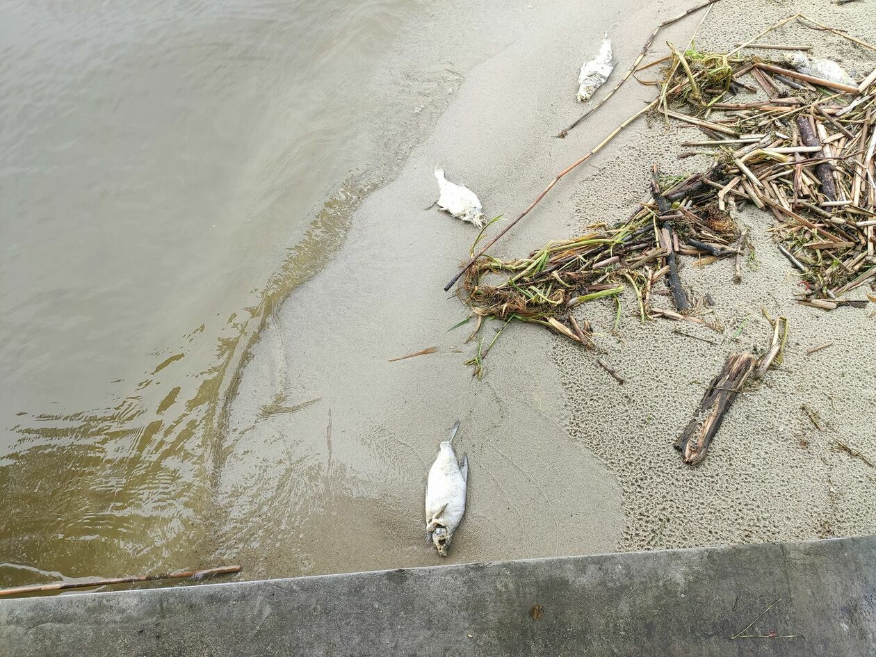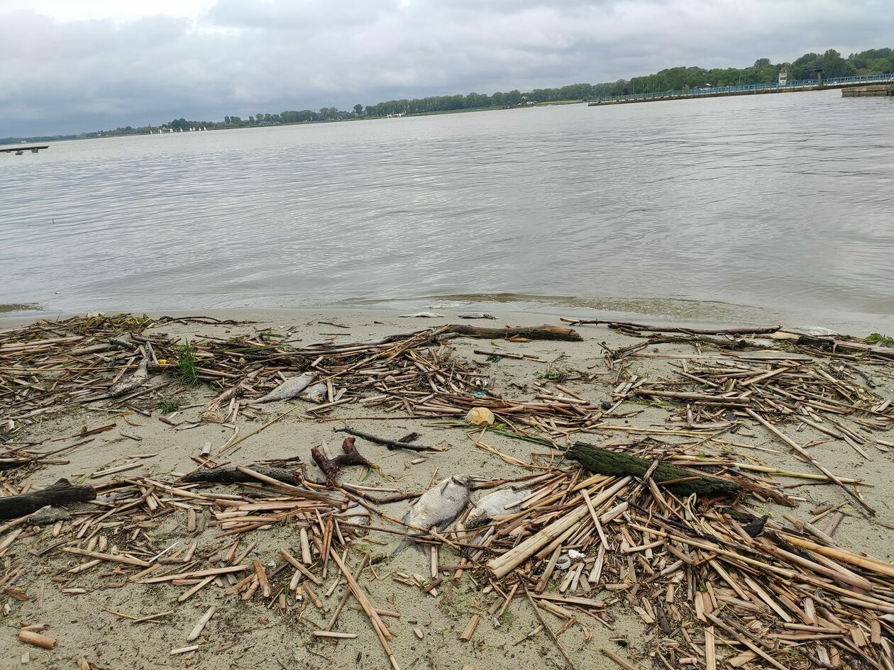 Śnięte ryby na brzegu Zalewu Zemborzyckiego