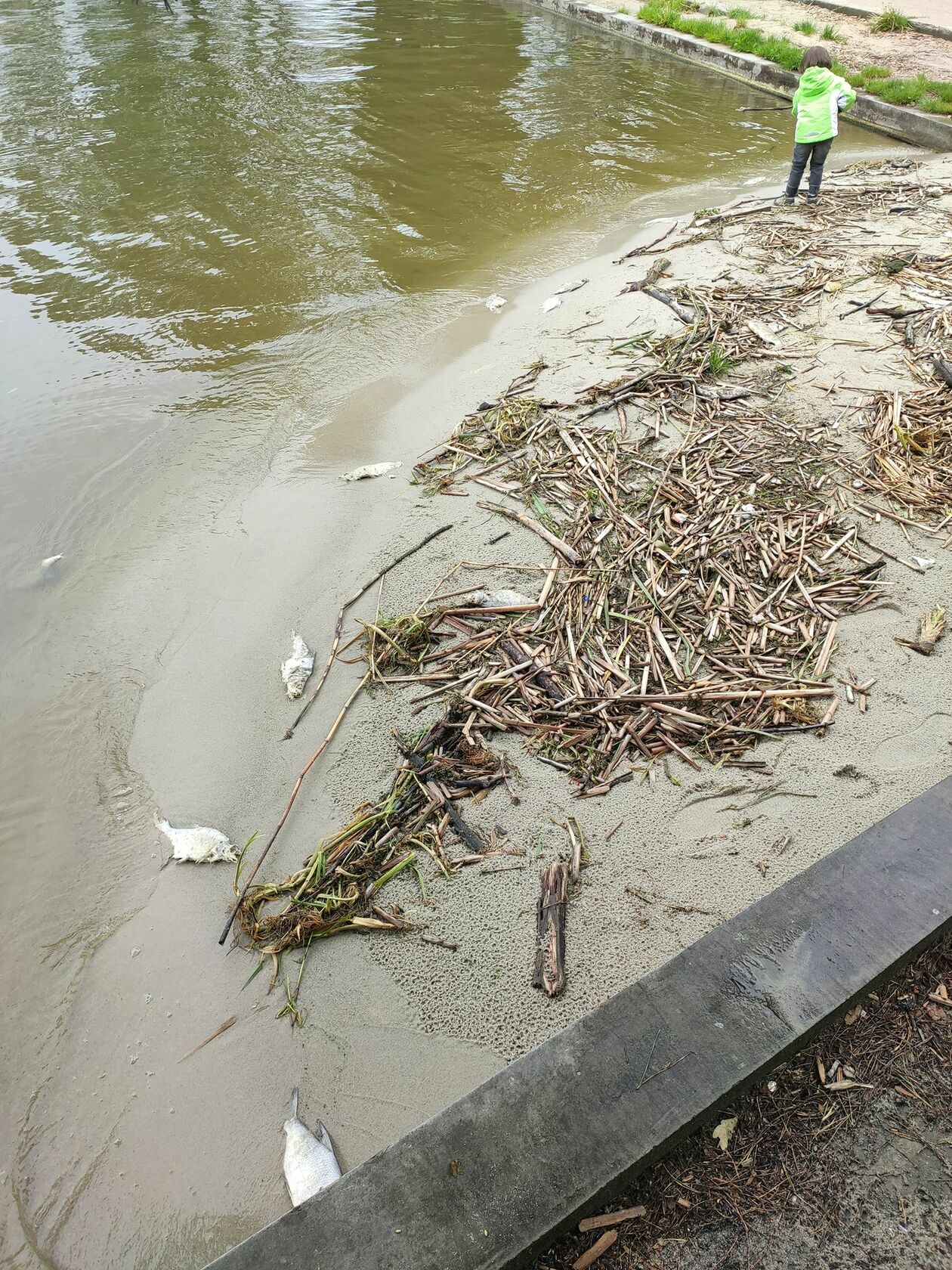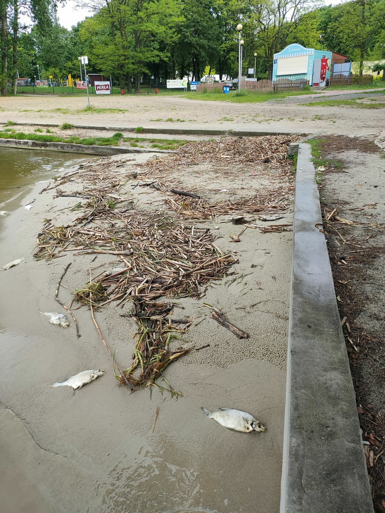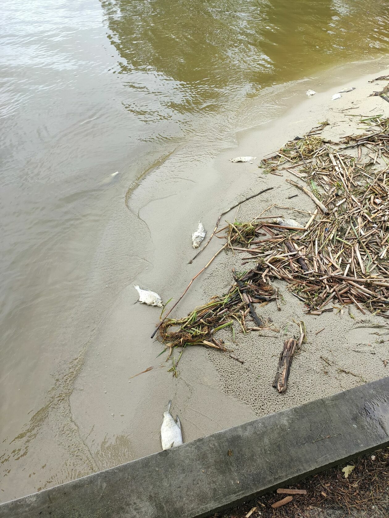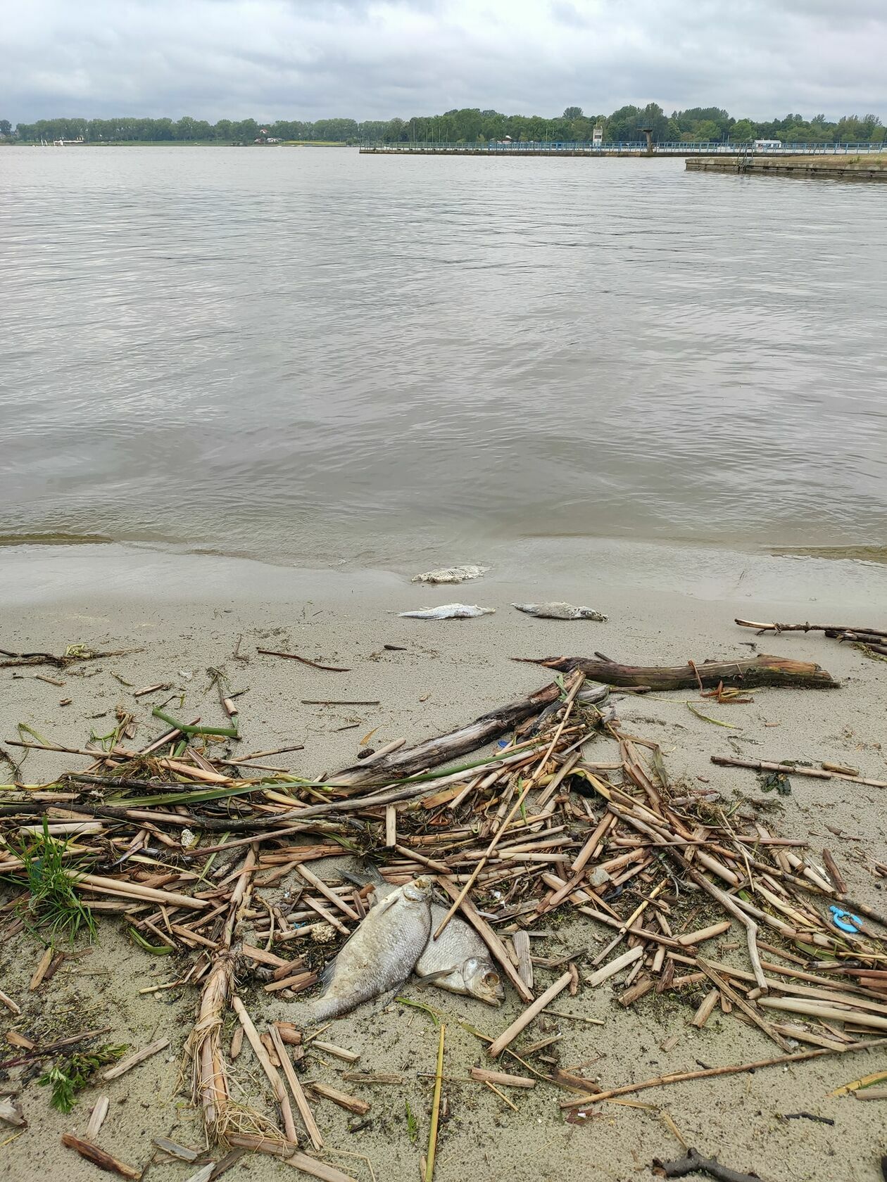 Śnięte ryby na brzegu Zalewu Zemborzyckiego