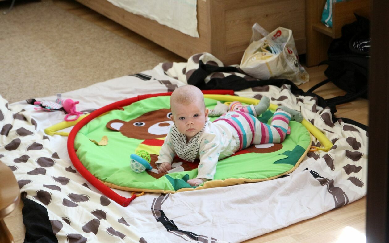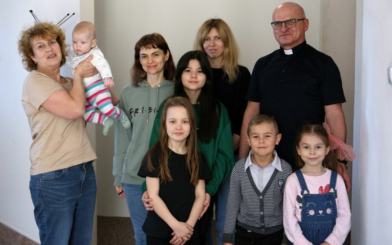 Na zdjęciu ksiądz Krzysztof Krakowiak, a także m.in. Julia, Marianna, Ksenia, Angelina i Sasze. To tylko część rodzin, jakie trafiły do parafialnego domu przy ul. Kowalskiego w Puławach