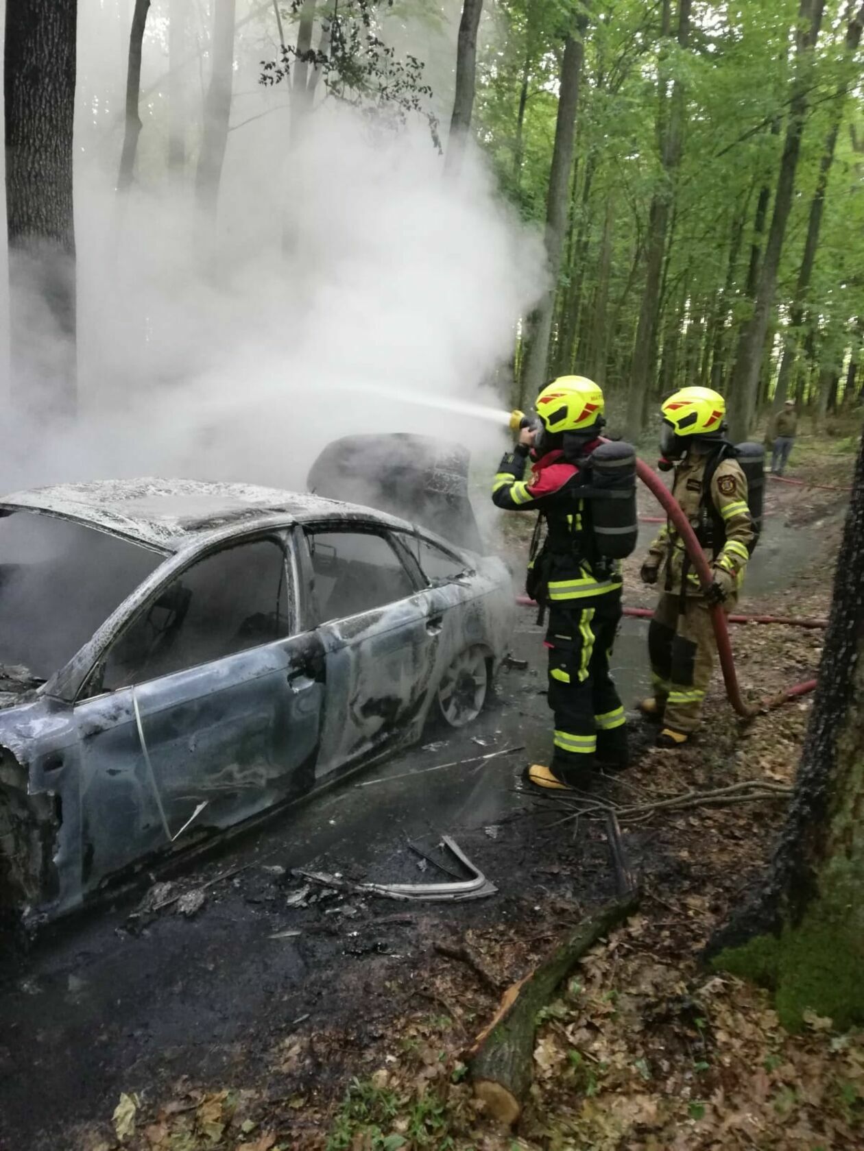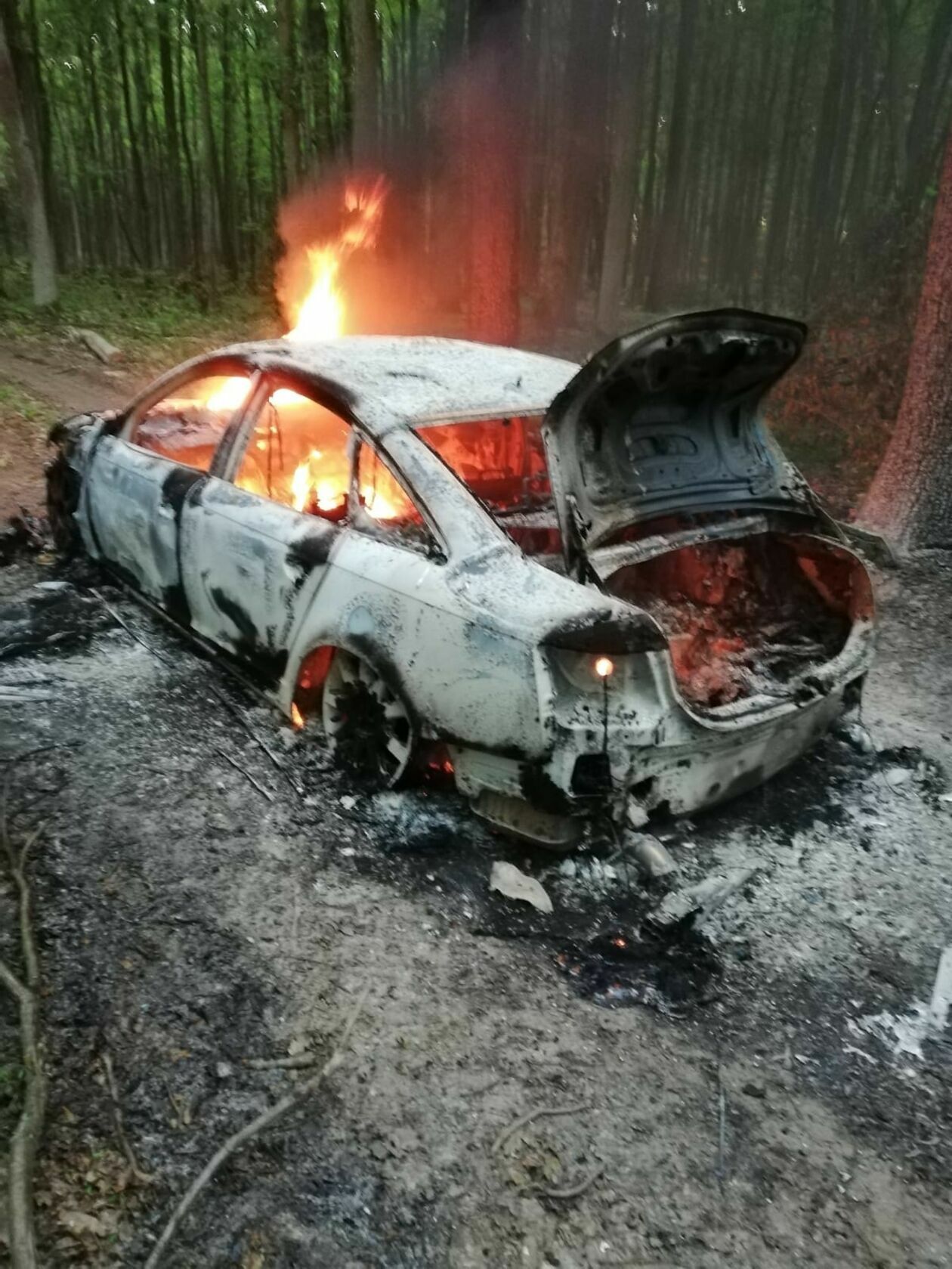 Porzucone i podpalone auto w lesie