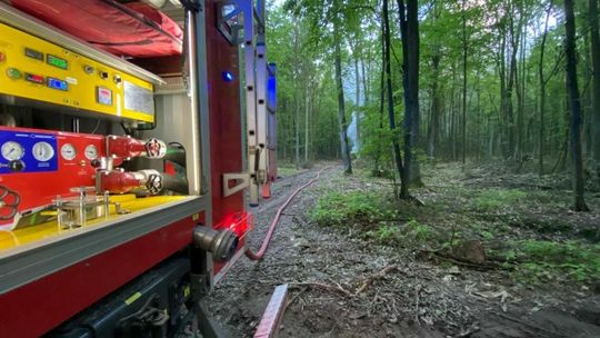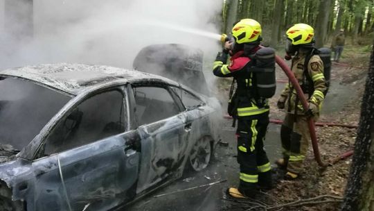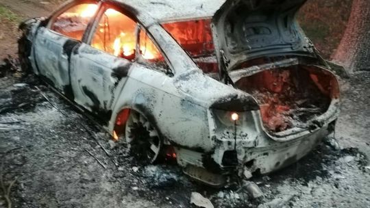 Podpalone auto, pozostawione w lesie pomiędzy Strzeszkowicami a Kreżnicą Jarą